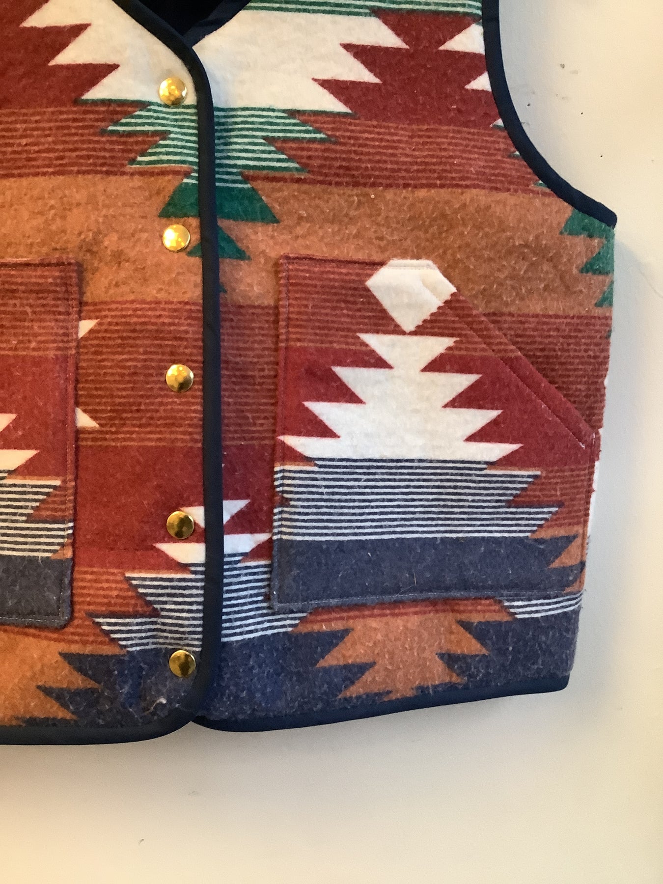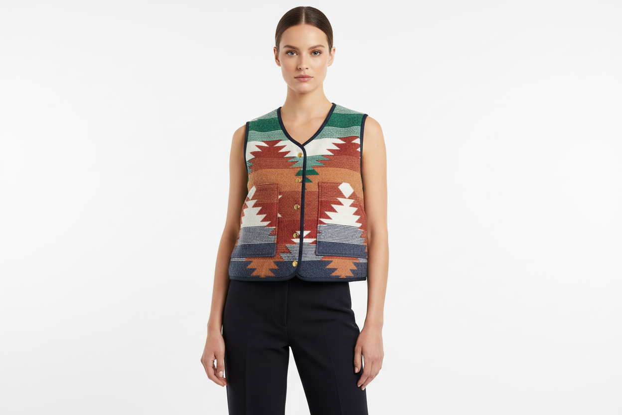 A handcrafted quilted vest made in Nelson, British Columbia using sustainably sourced and reclaimed textile materials. Featuring a bold southwest-inspired pattern in earthy greens, rust, cream, and navy, this vest is designed to be both functional and timeless.