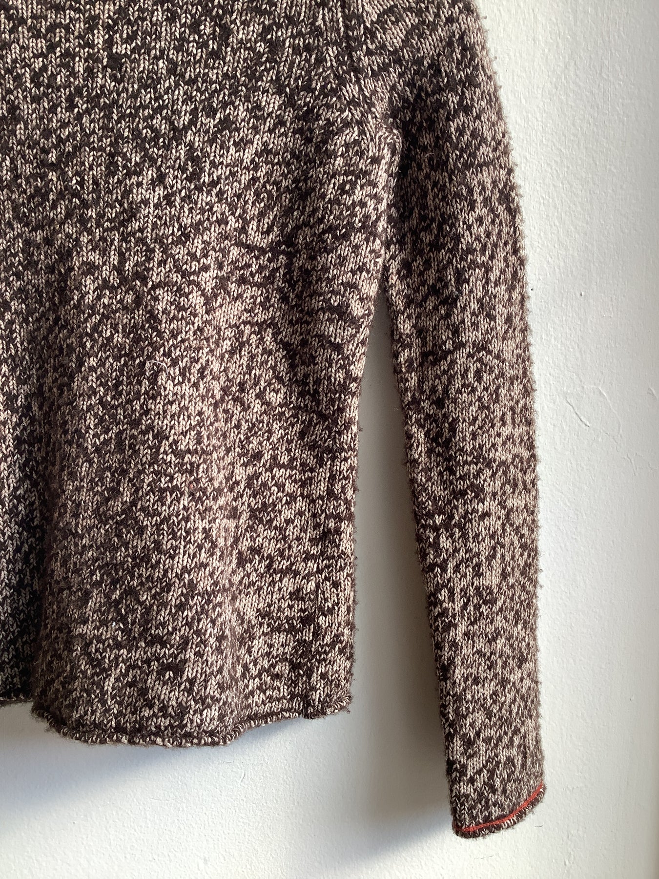 Cozy and classic, this vintage GAP sweater features a high foldover turtleneck and long sleeves in a marled brown-and-cream knit. Made with a soft, medium-weight yarn, it’s perfect for layering on chilly days or styling with denim for that effortless ‘90s/early Y2K look. Size Small but fits more like XS