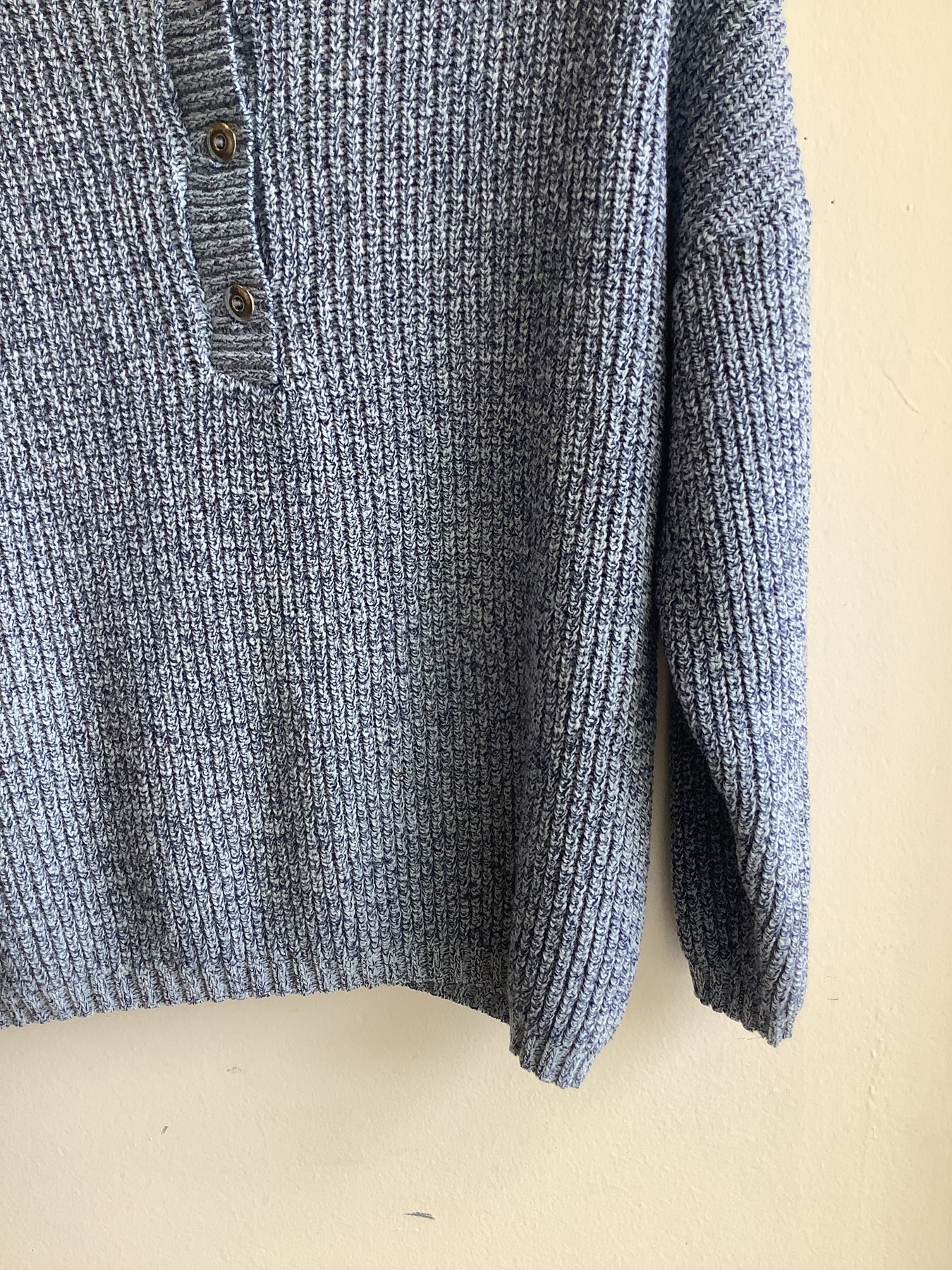 This vintage knit henley from 19th Avenue is the perfect blend of cozy and timeless. Featuring a soft ribbed texture, button-up henley neckline, and relaxed fit, it’s a versatile layering piece that works for every season. The dusty blue hue adds a laid-back, effortless feel that pairs beautifully with denim or skirts for that lived-in vintage look. Fits like a Med/Large