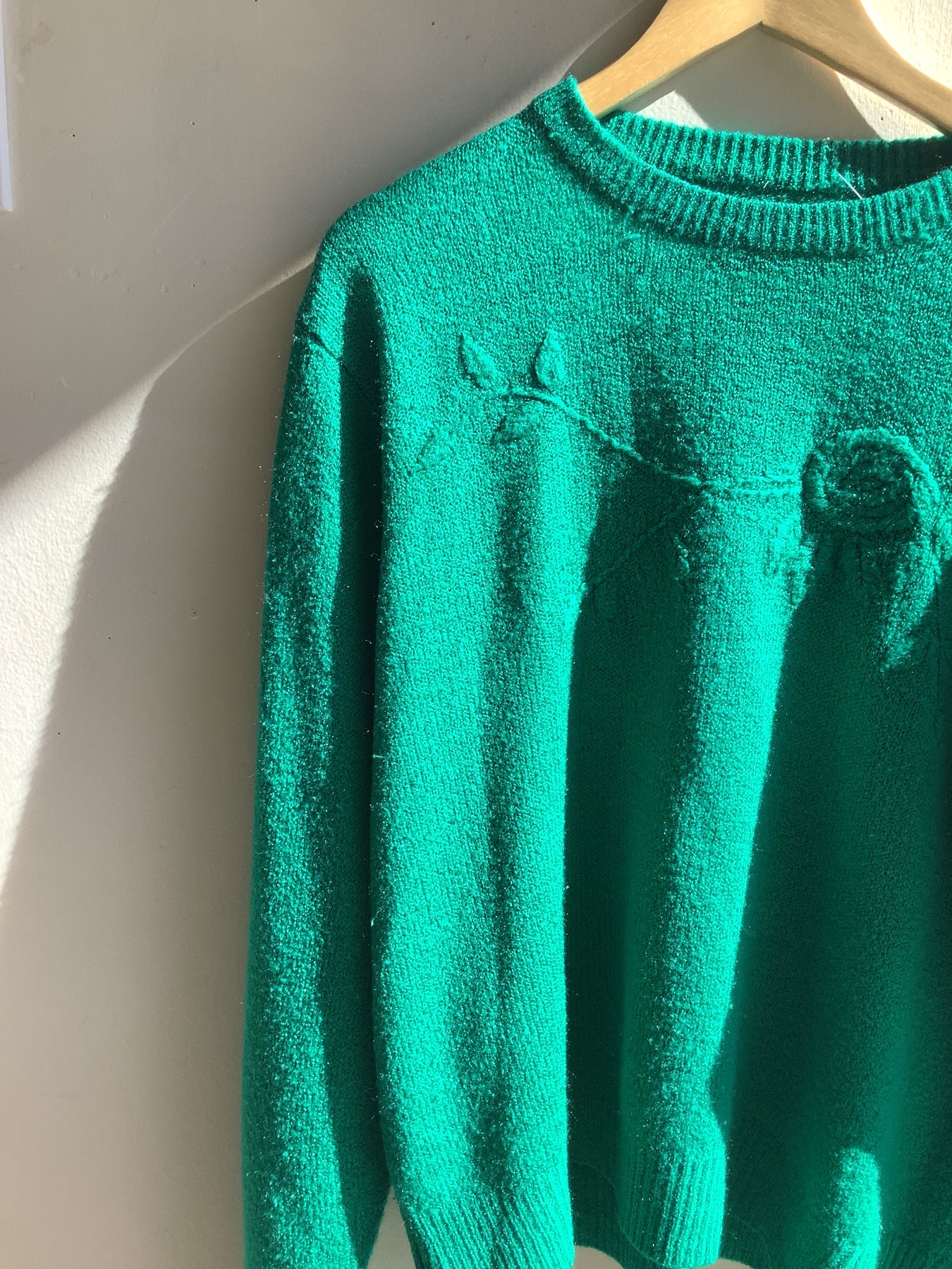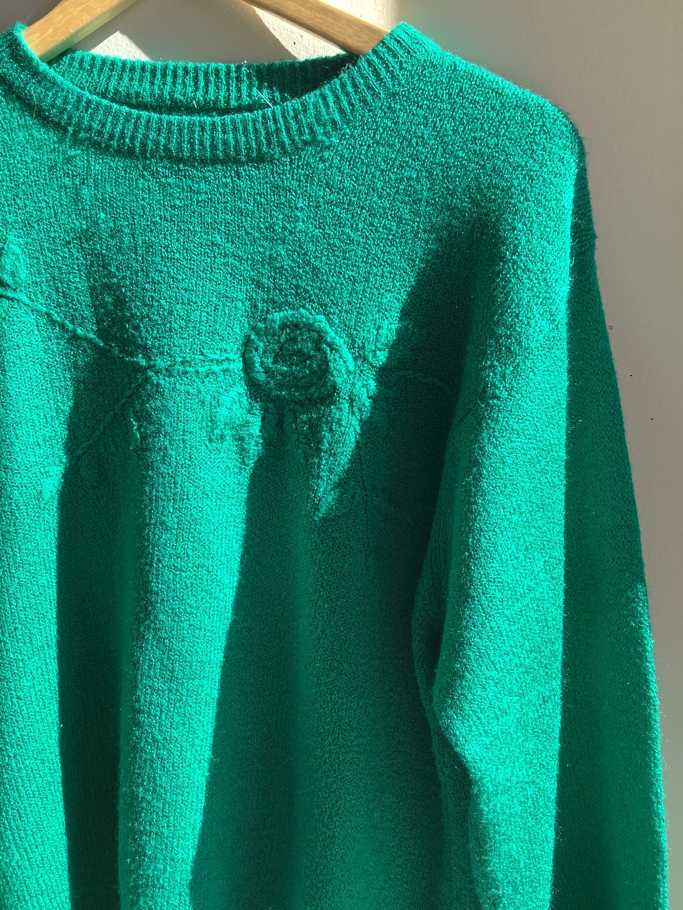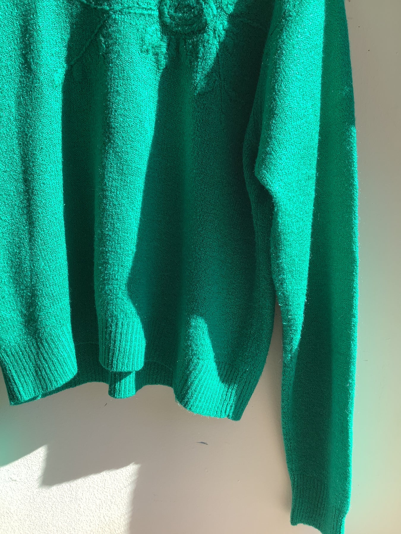 Bright and bold, this vintage kelly green sweater is a true statement piece. Featuring a subtle raised knit design across the chest (with hints of floral/abstract texture), it brings character while still being easy to style. Soft acrylic knit with a classic crew neckline and ribbed cuffs/hem, making it perfect for layering or wearing on its own for a pop of color. Fit like a Med/large