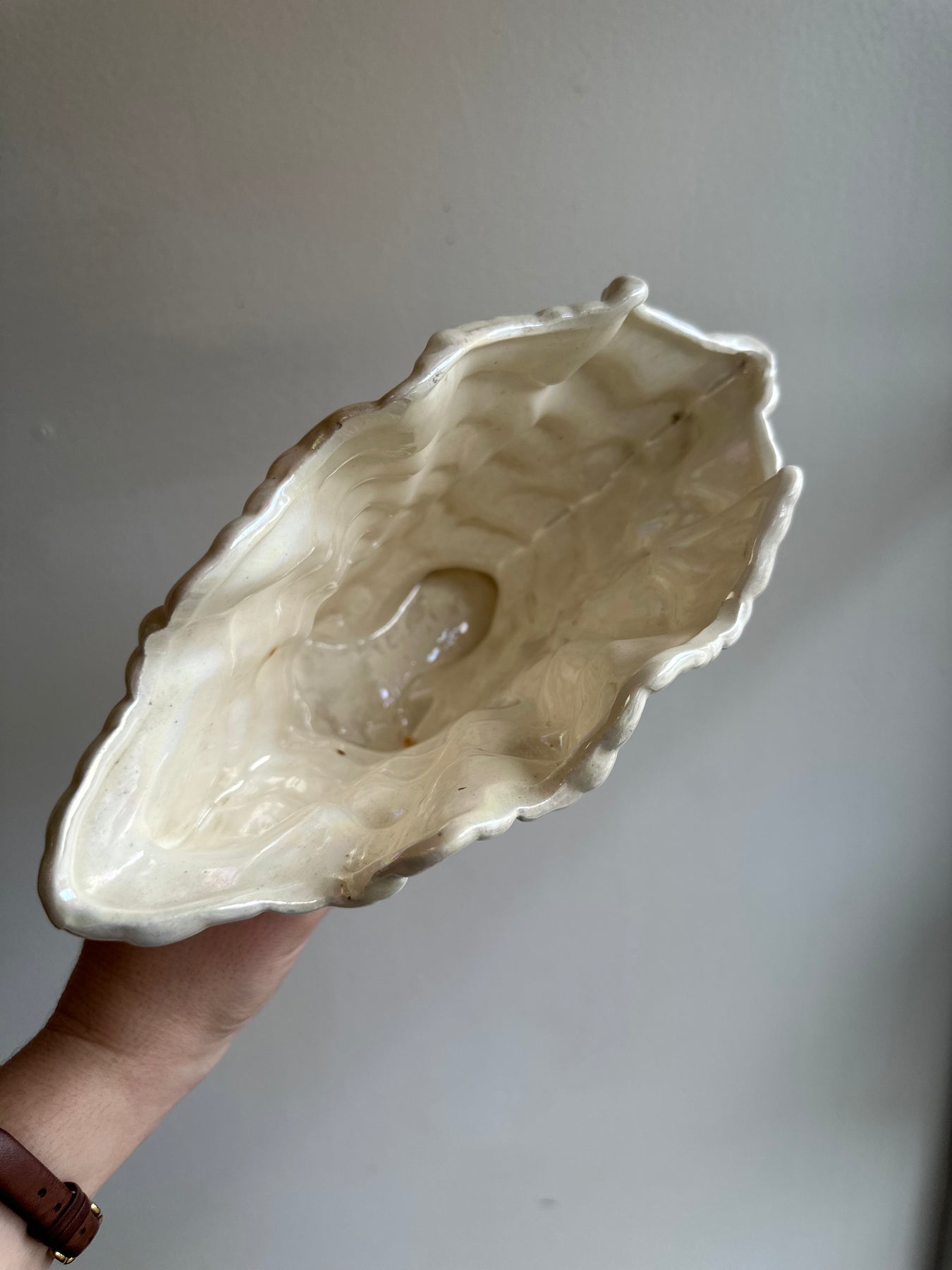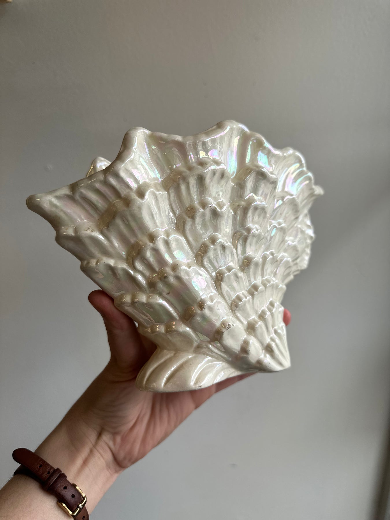 Vintage 1980s Maddeaux White Pearl Lustre Glaze Shell Shaped Vase