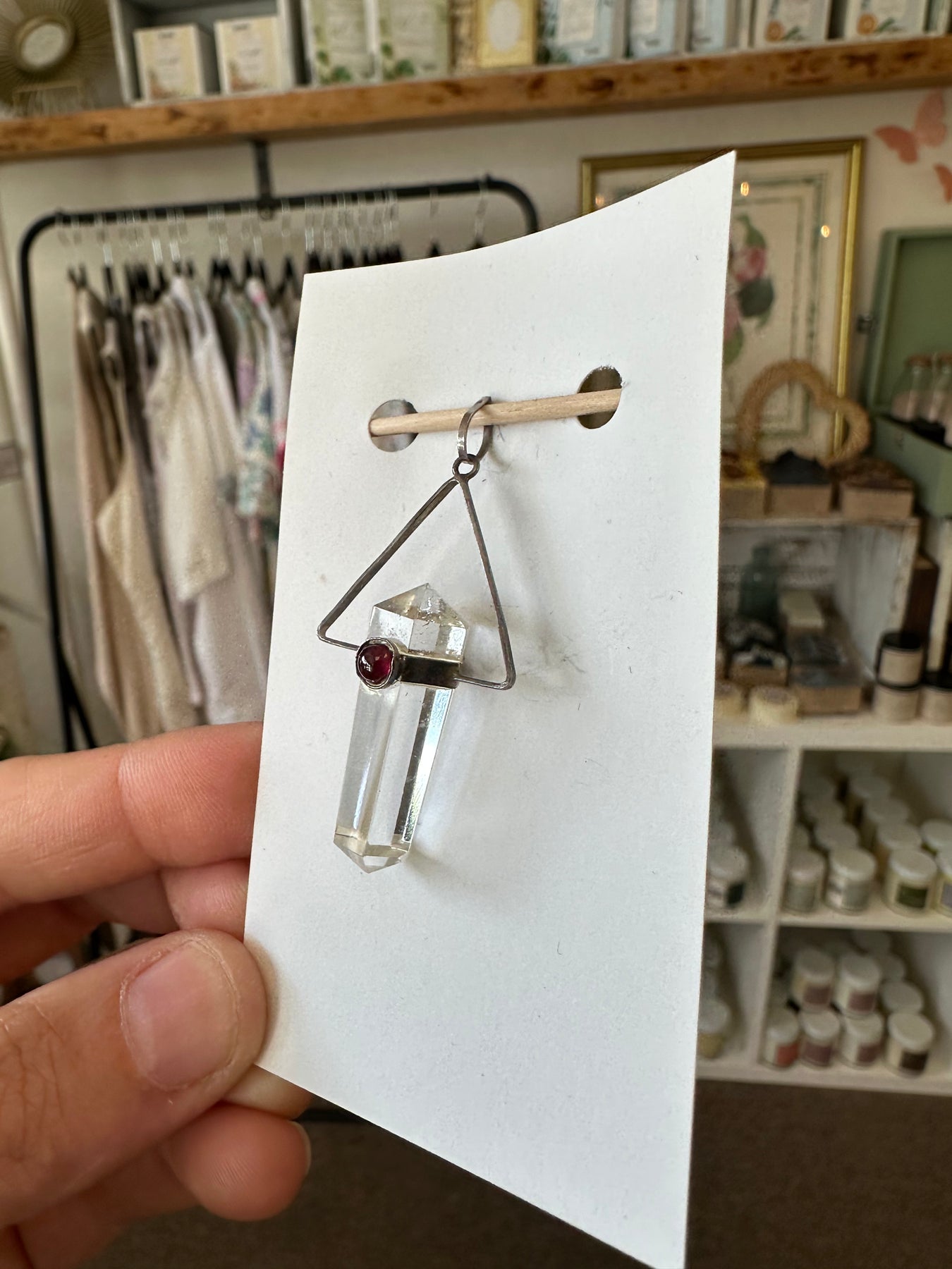 The Vintage Clear Quartz with Garnet Silver Pendant is a captivating blend of elegance and earthy beauty. Featuring a clear quartz stone known for its clarity and light-reflecting properties, this pendant is accented by a rich, deep red garnet that adds a touch of warmth and sophistication. Set in a finely crafted silver frame, the pendant highlights the interplay between the cool transparency of quartz and the vibrant hue of garnet. This combination makes it a versatile accessory that can complement both casual and formal outfits. Ideal for those who appreciate the unique allure of gemstone jewelry, this pendant is a timeless piece that brings a subtle yet striking elegance to any jewelry collection.