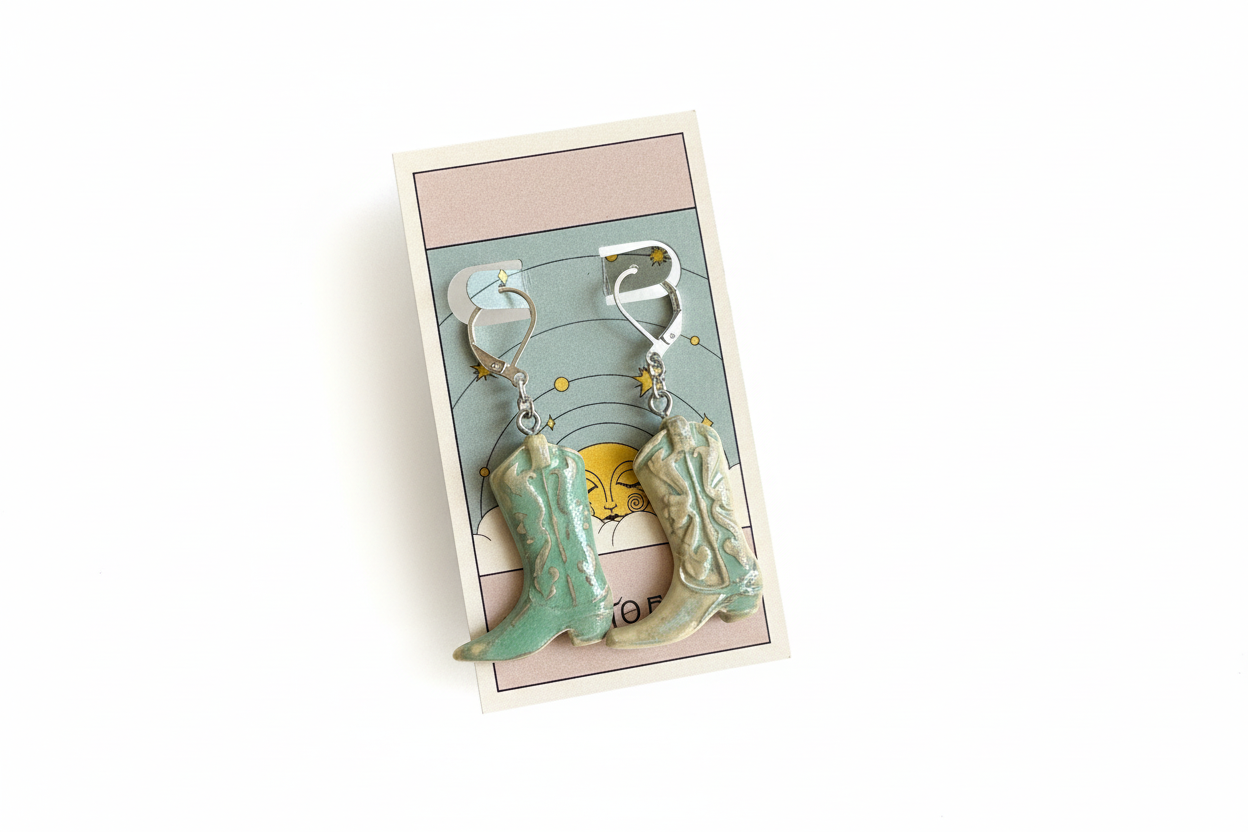 Hand-sculpted ceramic cowboy boot earrings in soft sage and sand hues. A whimsical nod to Western charm with a dreamy glaze and lightweight design—perfect for barefoot days and starry nights.