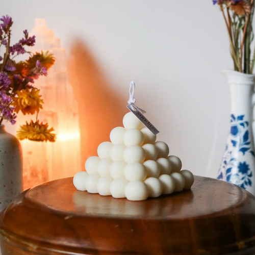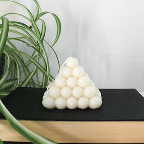 The Bubble Pyramid candle is a stunning and mesmerizing addition to any space. This gorgeous pyramid candle features a unique bubble design that will draw one's eye to its beauty and glow.