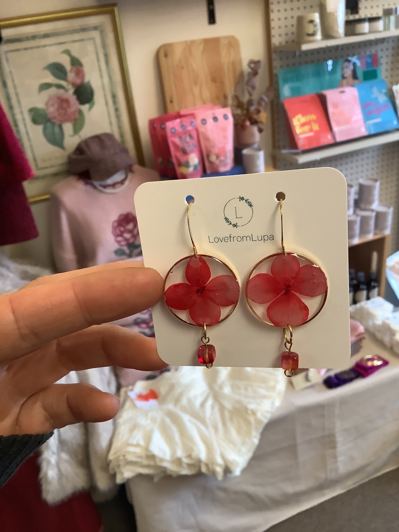 Real pressed red flowers are preserved in clear resin and set in a gold circle frame, finished with a small coordinating glass bead drop. Lightweight with classic ear hooks, these earrings add a soft pop of color while remaining easy to wear. Each pair is one of a kind.