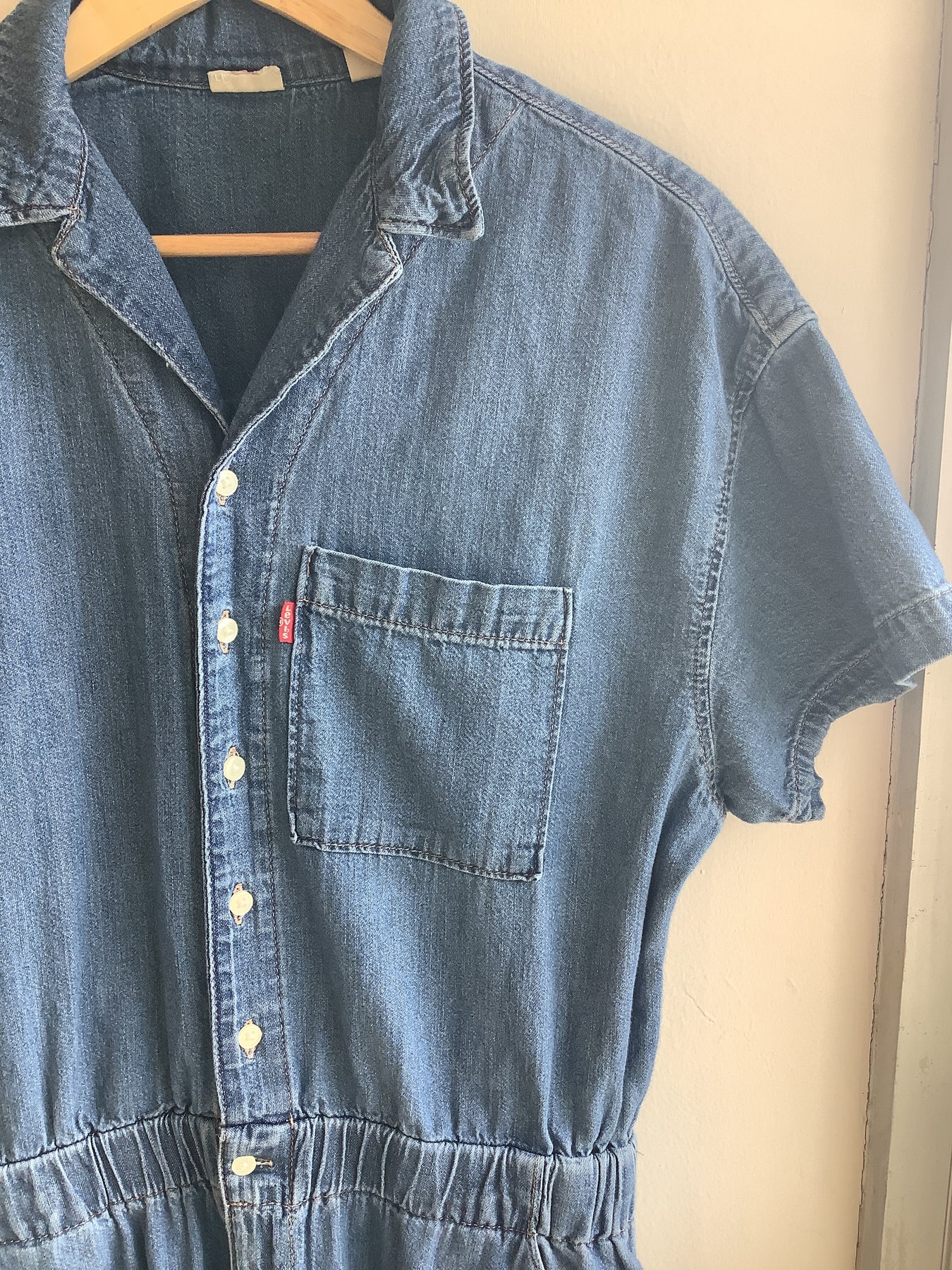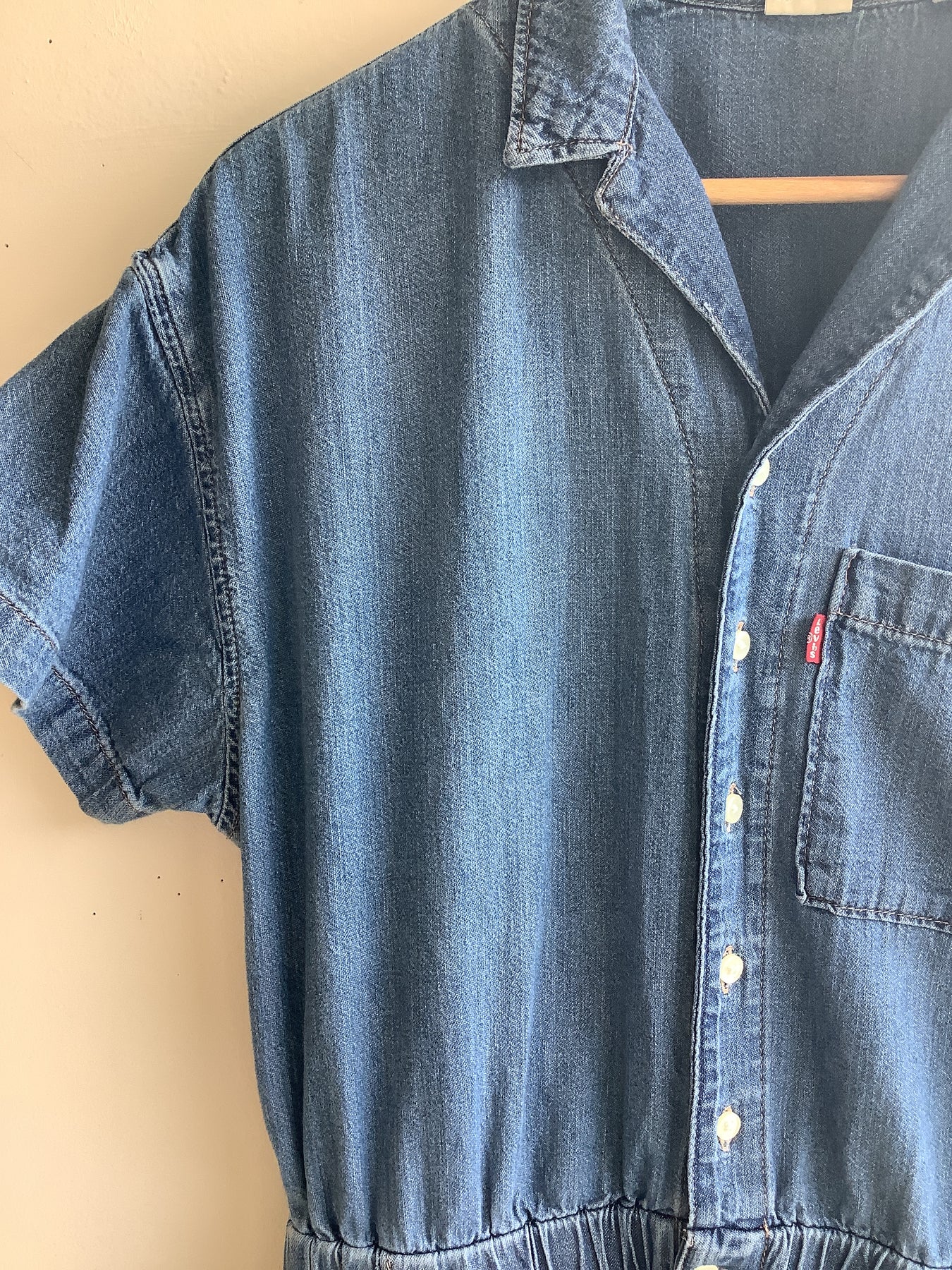 Soft 100% cotton denim jumpsuit with a relaxed, easy fit. Features a button-front closure, short sleeves, elasticized waist for comfort, and a classic chest pocket detail. Lightweight and breathable with that perfectly worn-in feel. An effortless throw-on piece that works year-round layered or worn solo.