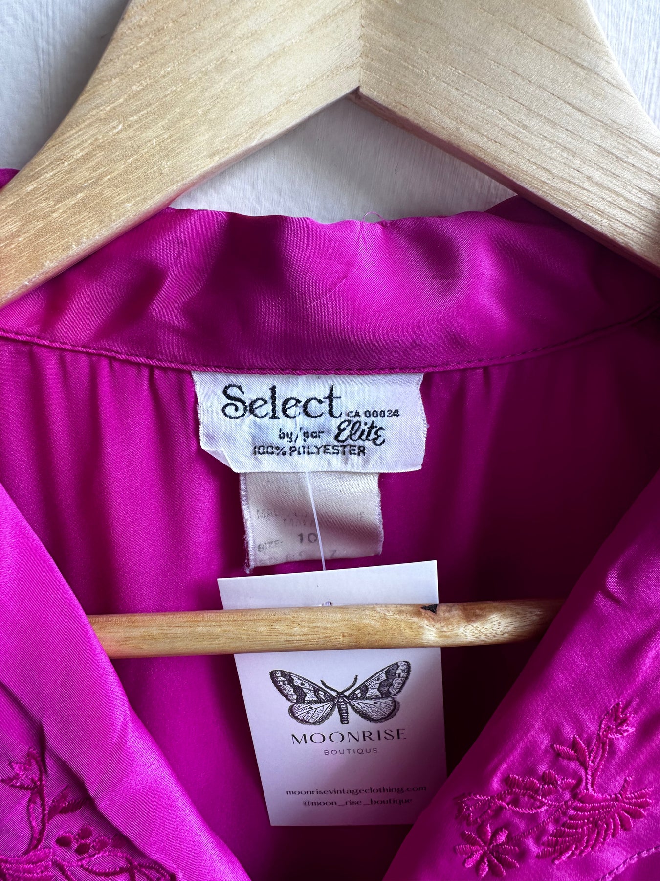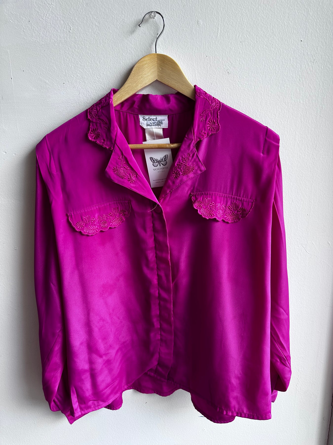 Make a statement in this vibrant magenta satin blouse, featuring delicate floral embroidery along the collar and faux pockets. The sheen catches the light beautifully, giving it an elevated feel, while the relaxed fit and flowy drape make it just as wearable with vintage denim as it is with a sleek skirt. A fun piece to dress up or down, with just the right amount of drama.
