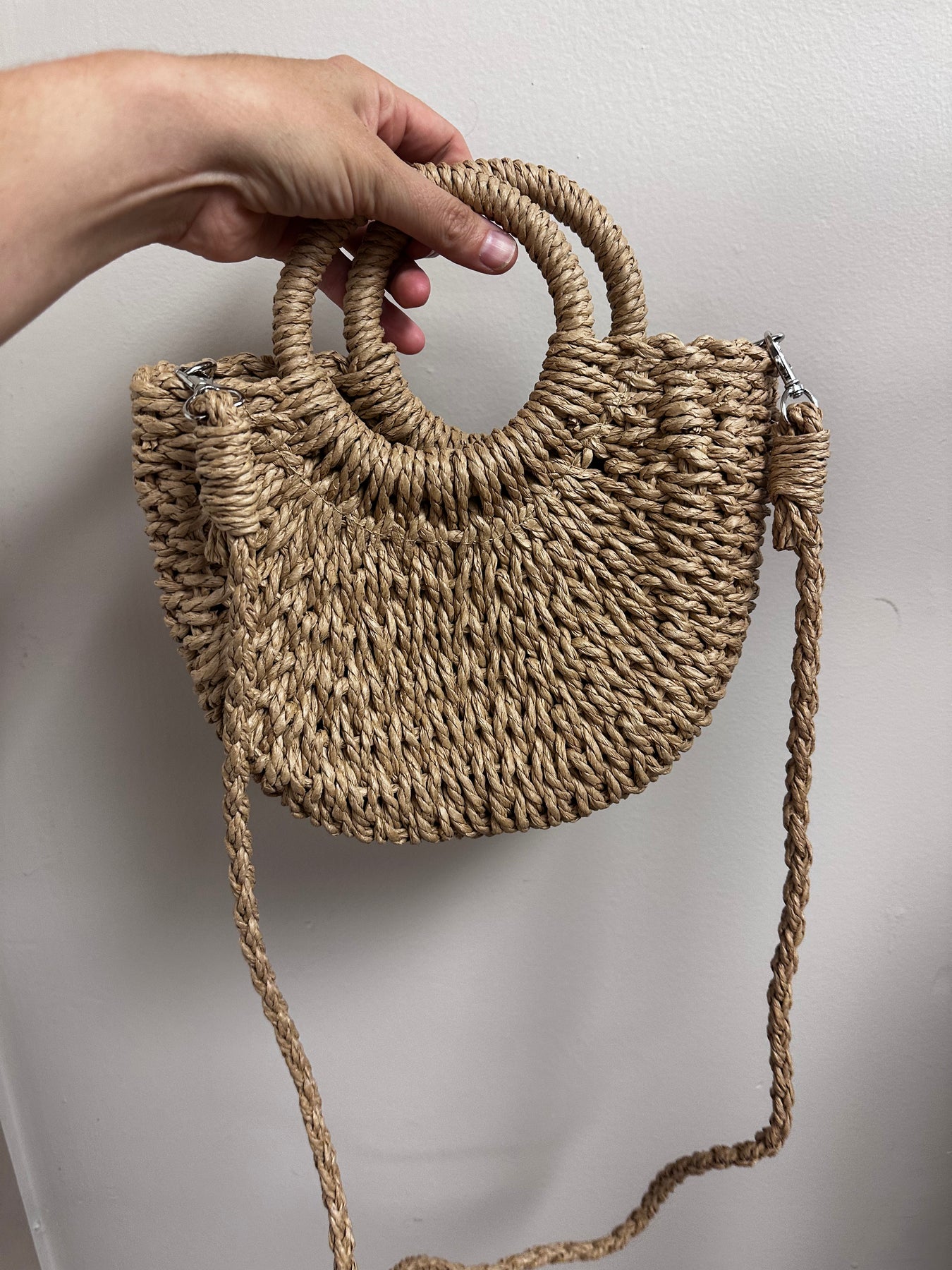 Earthy, playful, and effortlessly chic—this woven shoulder bag brings all the coastal cottage vibes. Made from durable natural fibers in a soft, beachy tan, it features two sturdy round handles and a detachable braided strap for easy crossbody wear. Fully lined and just roomy enough for your essentials, this bag is perfect for farmer’s markets, patio dates, or barefoot days in the sun.
