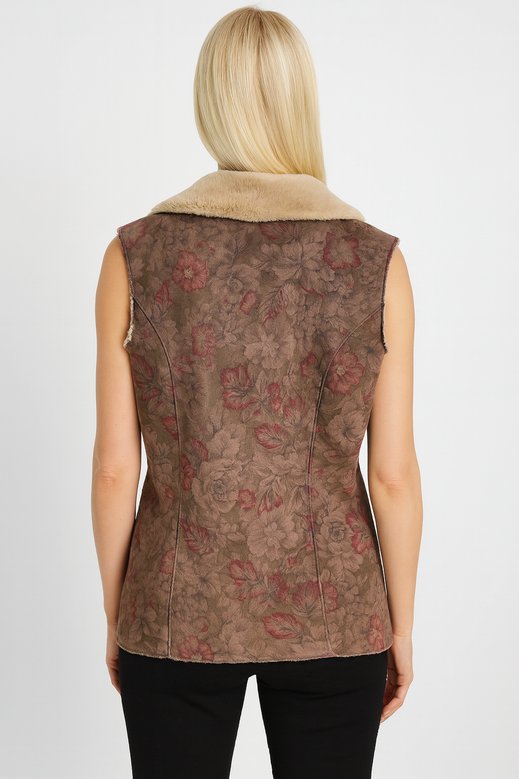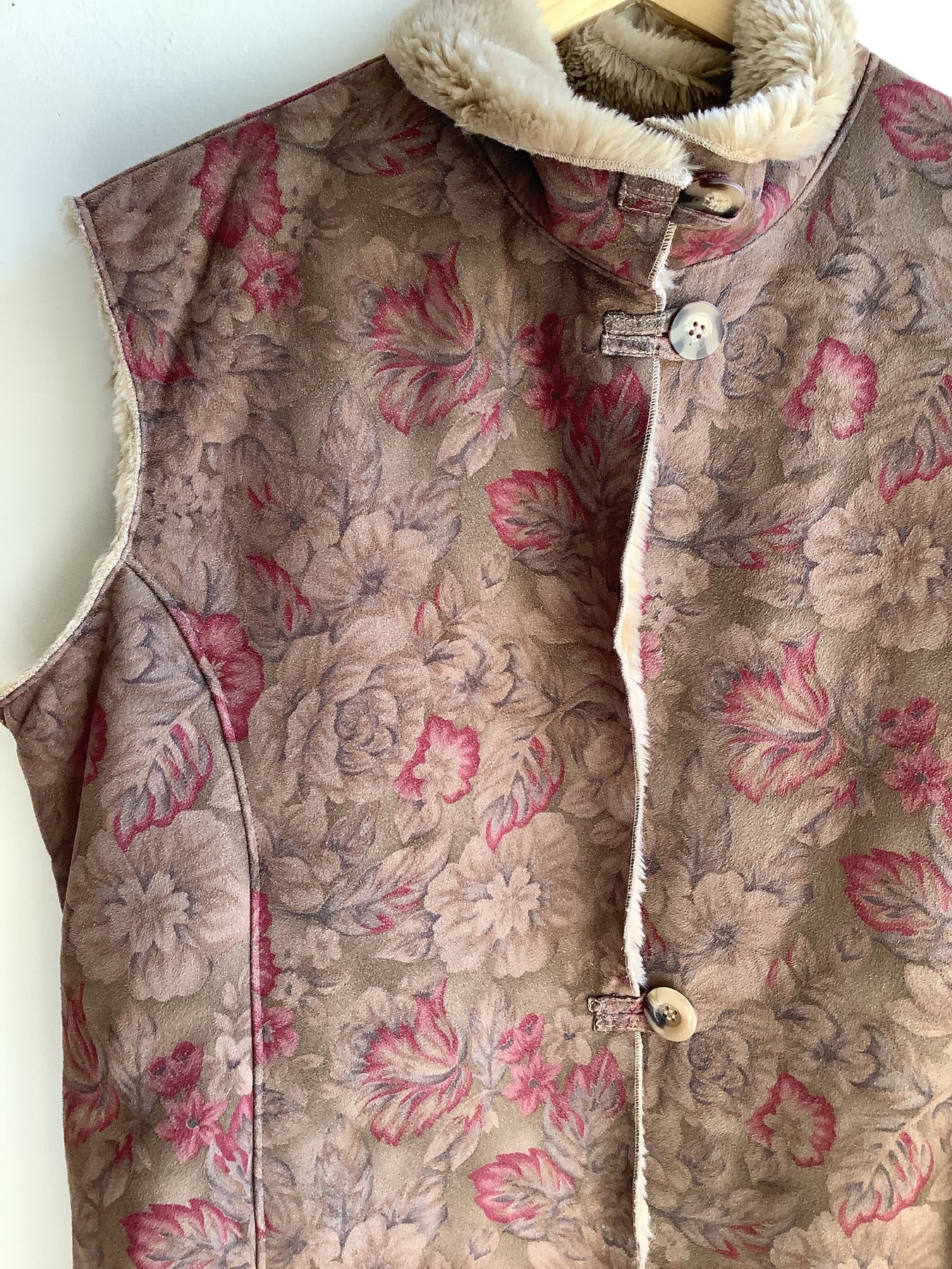 This vintage-inspired Coldwater Creek vest features a soft faux suede shell with a romantic floral pattern in muted rose and taupe tones. Lined with plush faux shearling for warmth and comfort, it closes with three rustic toggle buttons down the front. A perfect layering piece for adding cozy texture and feminine charm to your fall or winter outfits. Size Med