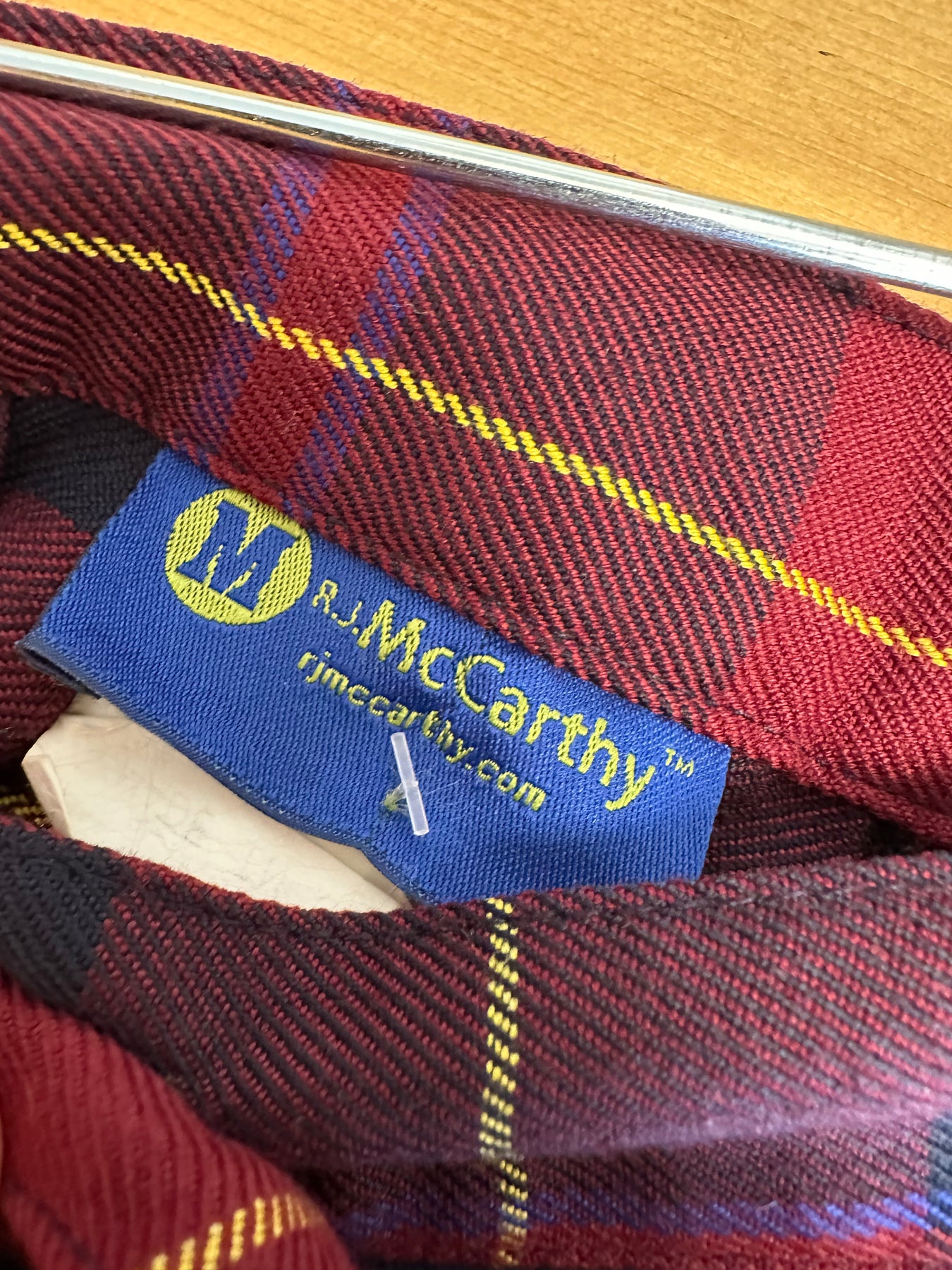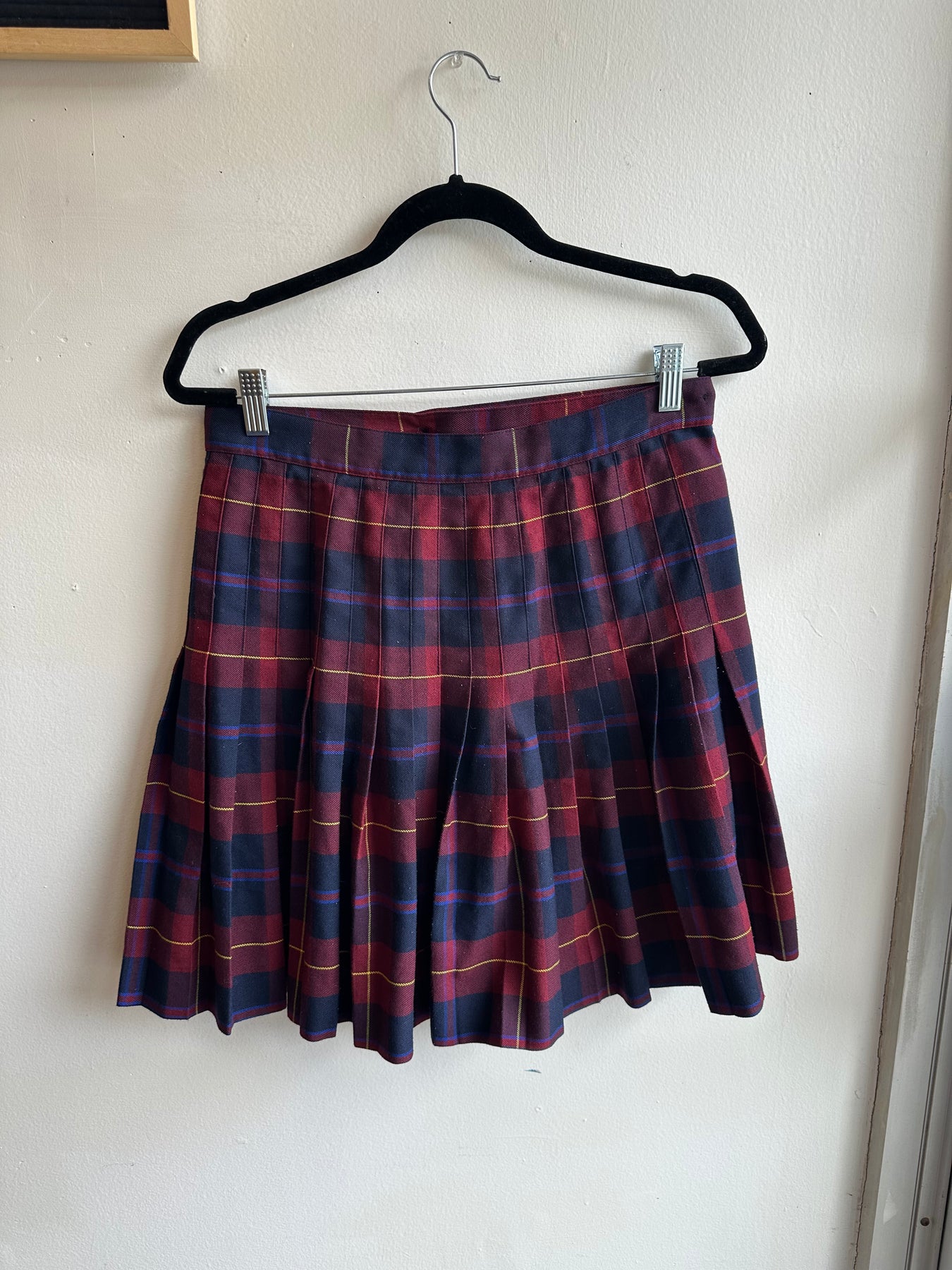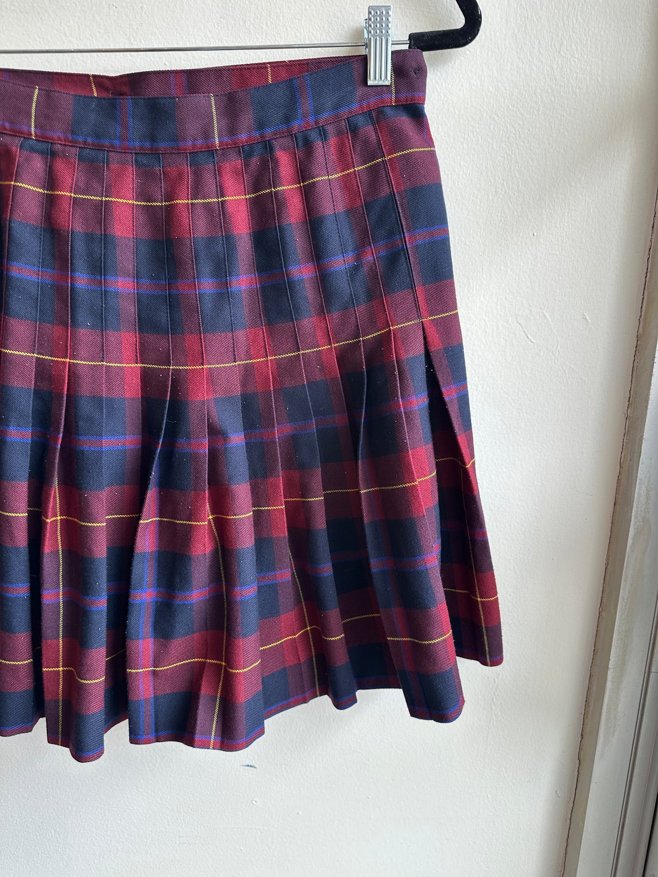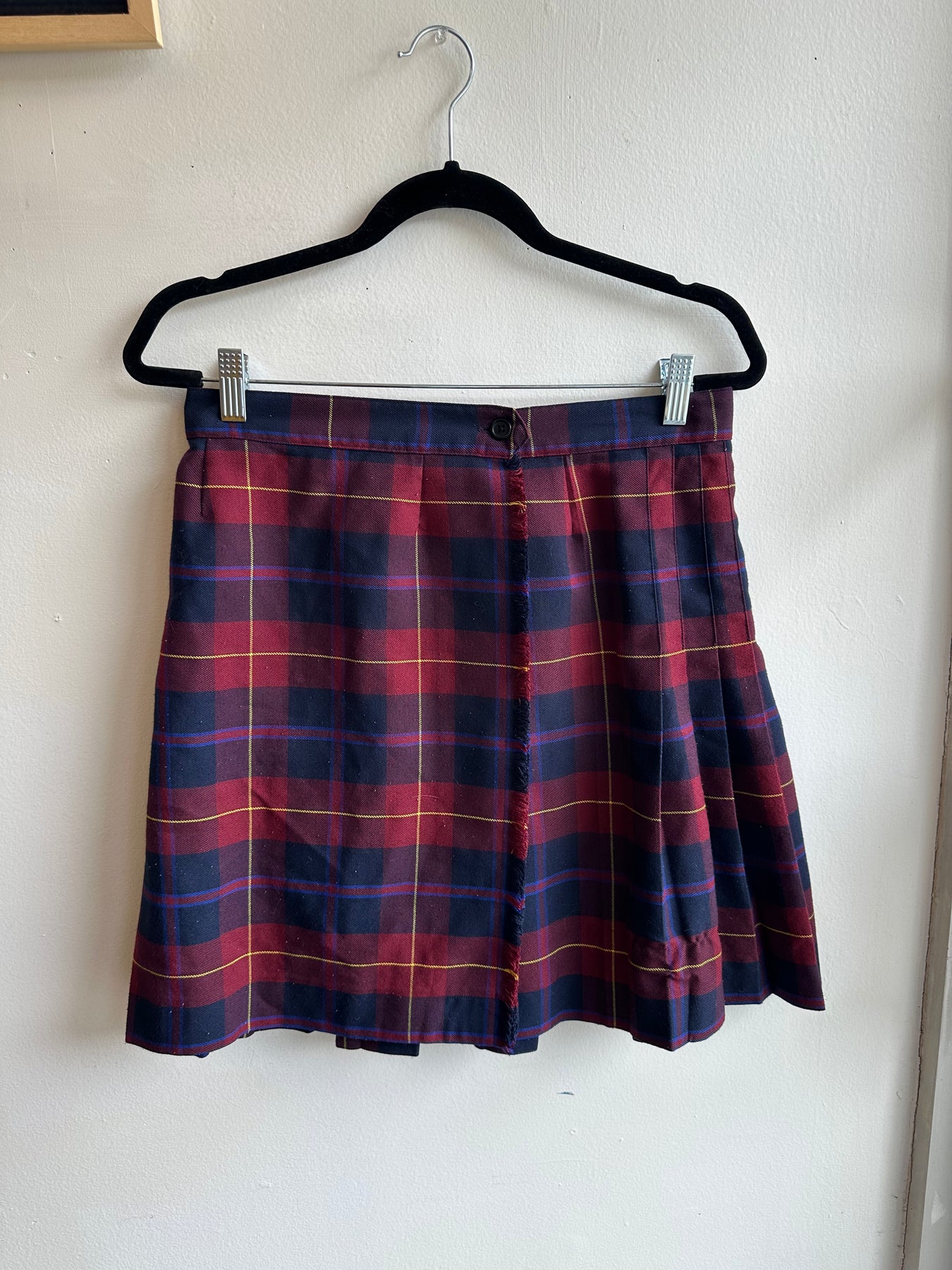 This vintage 80s mini skirt features a classic navy and red McCarthy plaid pattern, embodying timeless style and bold retro flair. Crafted from quality materials typical of the era, its structured fit accentuates your silhouette while offering a playful, nostalgic charm. Perfect for adding a touch of 80s chic to your wardrobe.