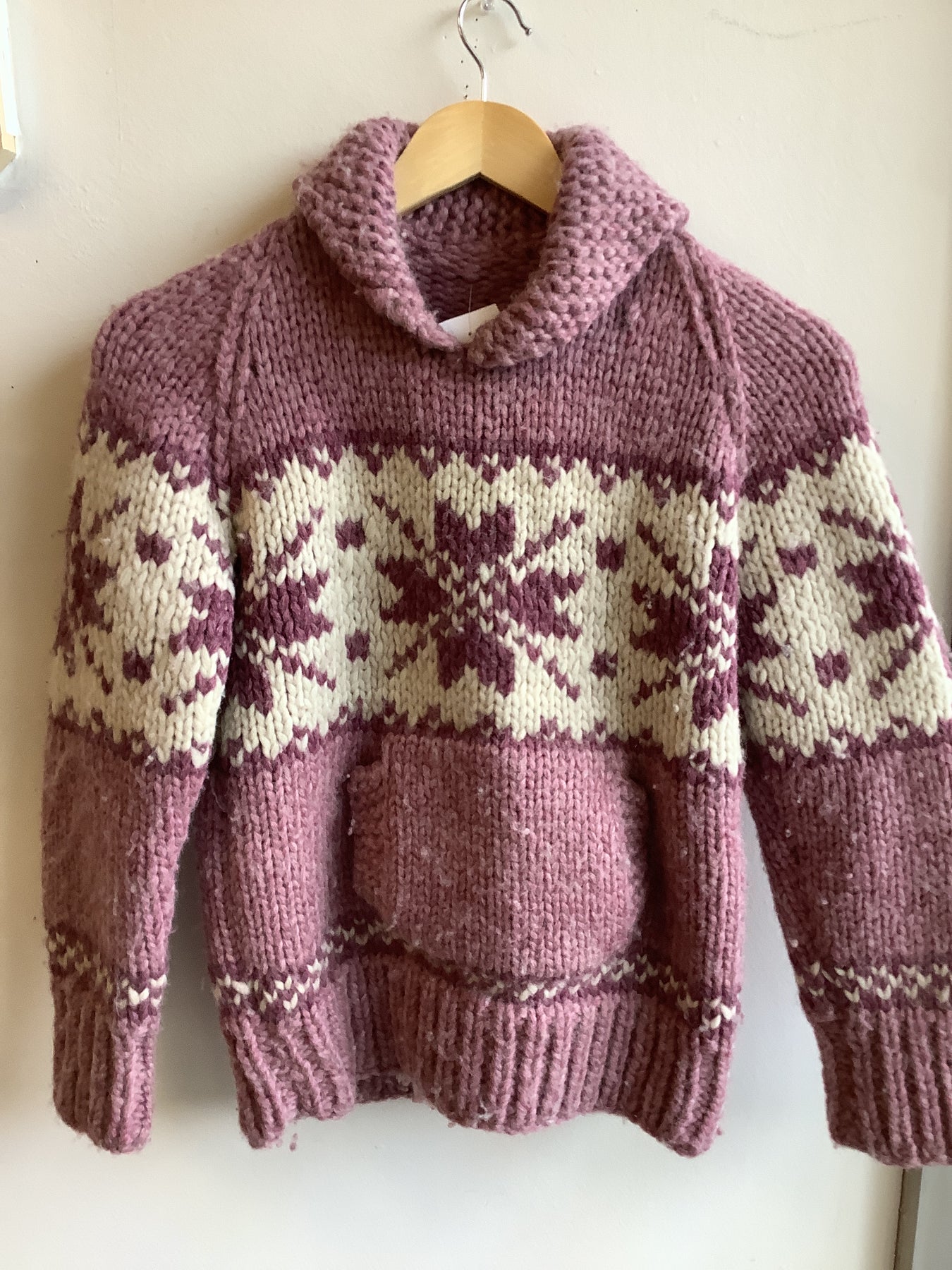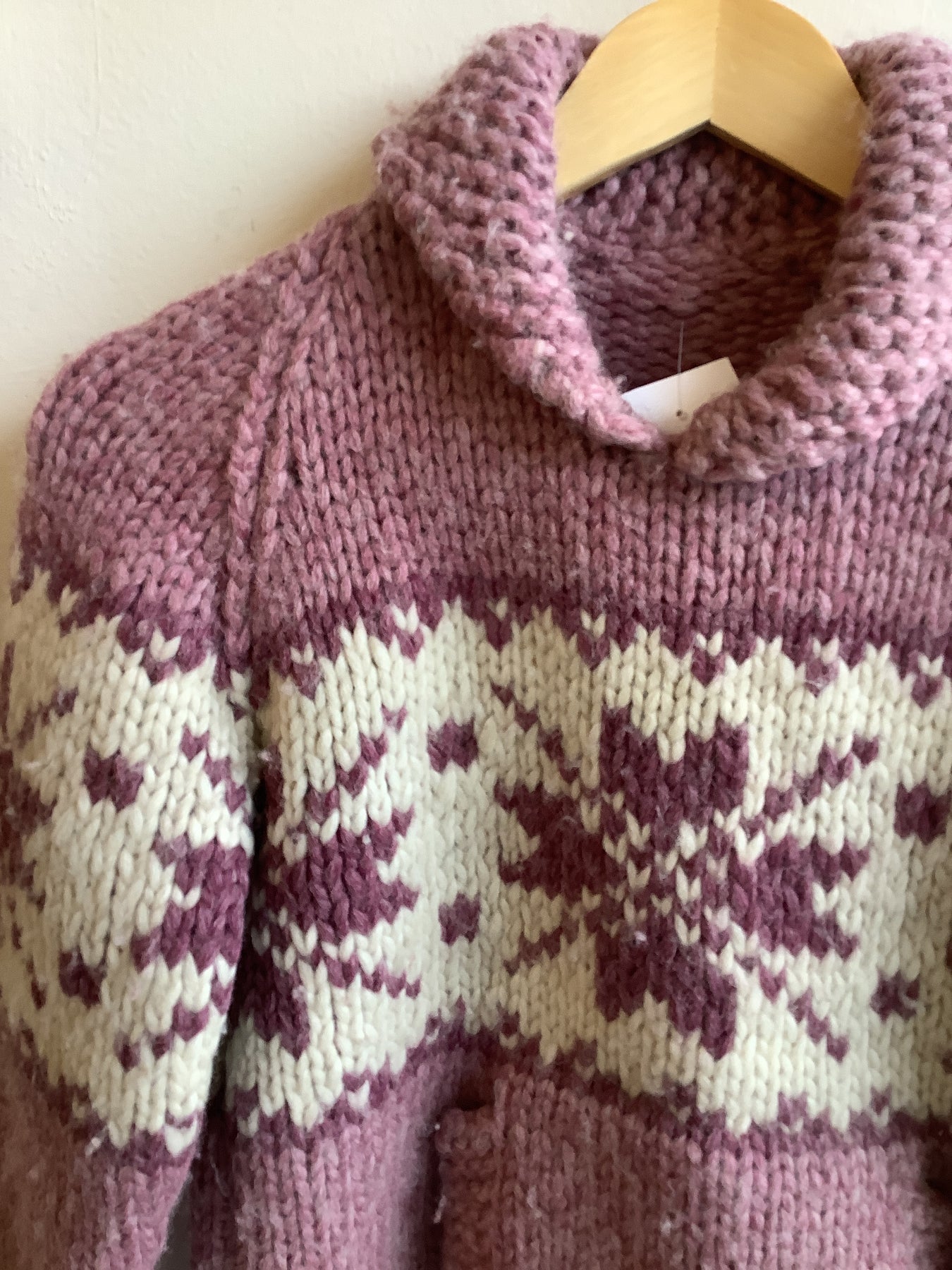 This chunky, hand-knit sweater brings all the cozy vintage charm with its bold Nordic snowflake pattern across the chest and sleeves. Crafted in a rich plum purple with creamy white accents, it features a shawl-style collar, front kangaroo pocket, and ribbed cuffs/hem. Perfect for après-ski vibes or layering on crisp autumn days.