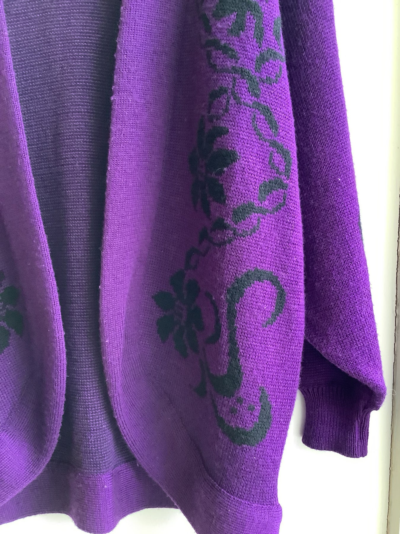 Bold and cozy, this vintage open-front cardigan features a rich purple base with black floral and scrollwork designs woven into the knit. Made by KnitWear – Hayashi Knit, this piece offers an effortlessly chic oversized fit with dropped shoulders, cuffed sleeves, and a relaxed drape that makes it perfect for layering. A statement knit that brings both comfort and standout style. Fits like a Med/Large