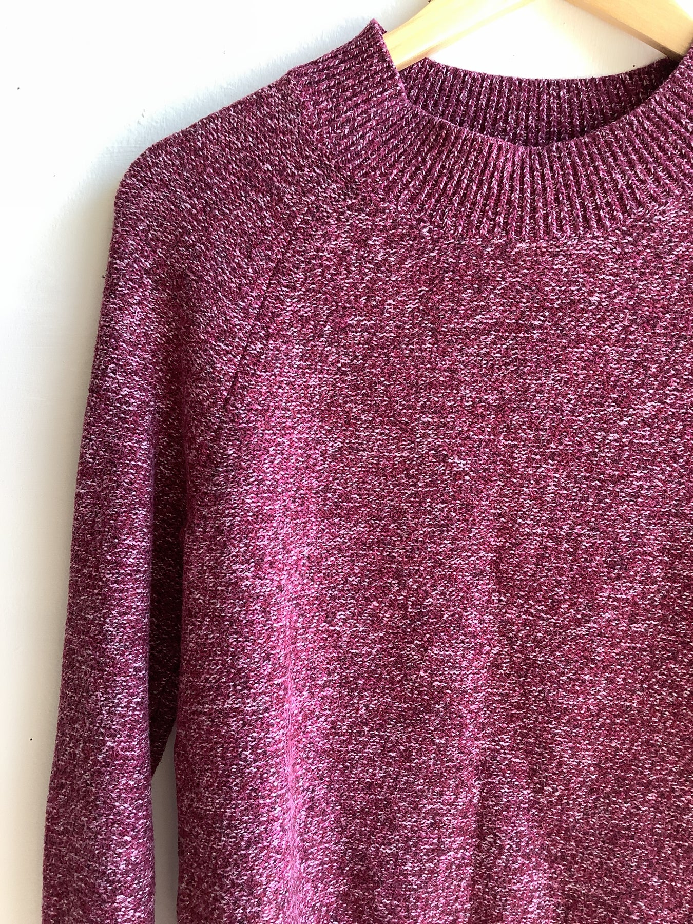 A classic cozy knit in a rich cranberry marled yarn, this vintage sweater blends comfort with timeless style. It features a crew neckline, ribbed cuffs, and hem, with a slightly boxy fit that makes it perfect for layering. The deep berry tone adds warmth and versatility—easy to dress up with a skirt or keep casual with denim.