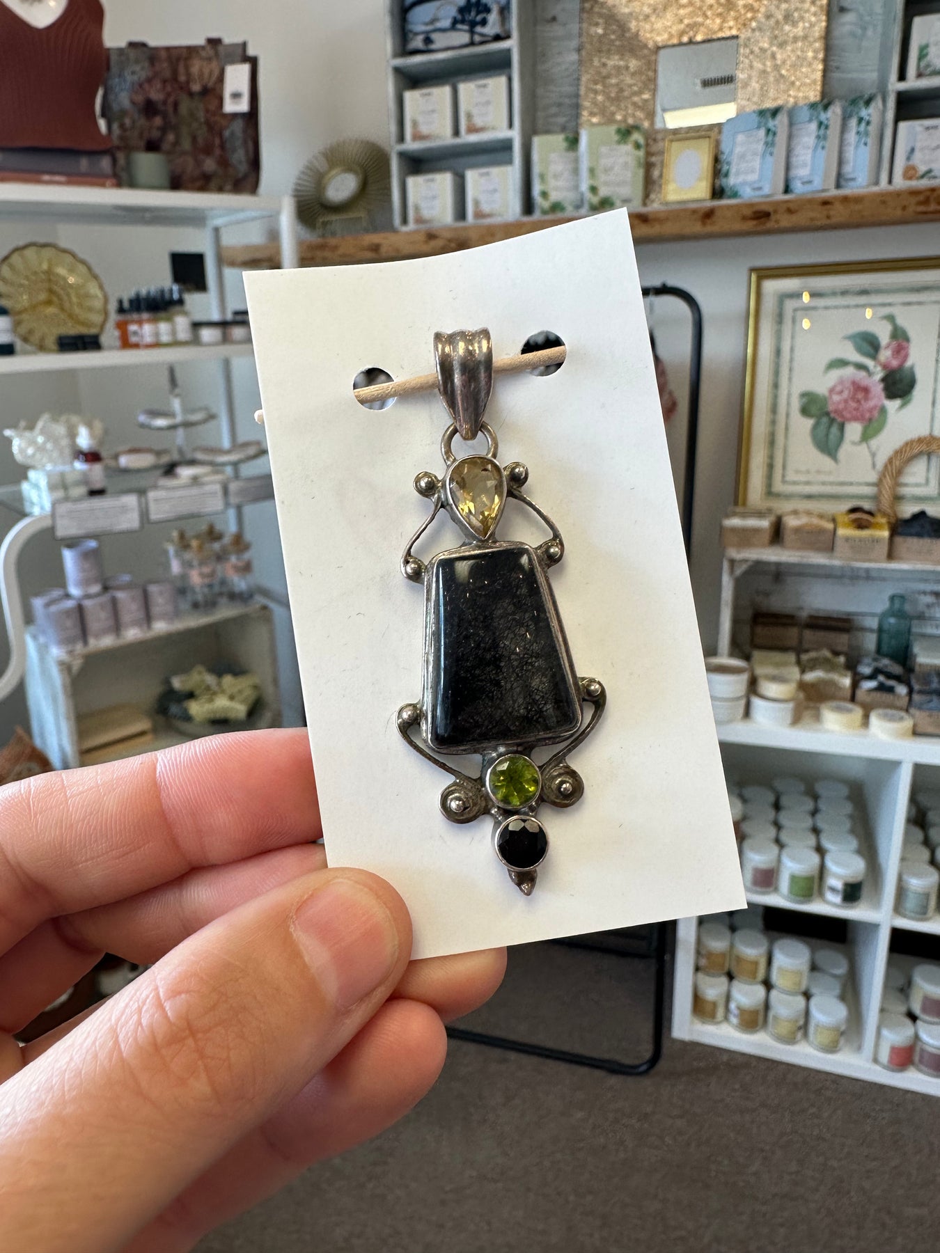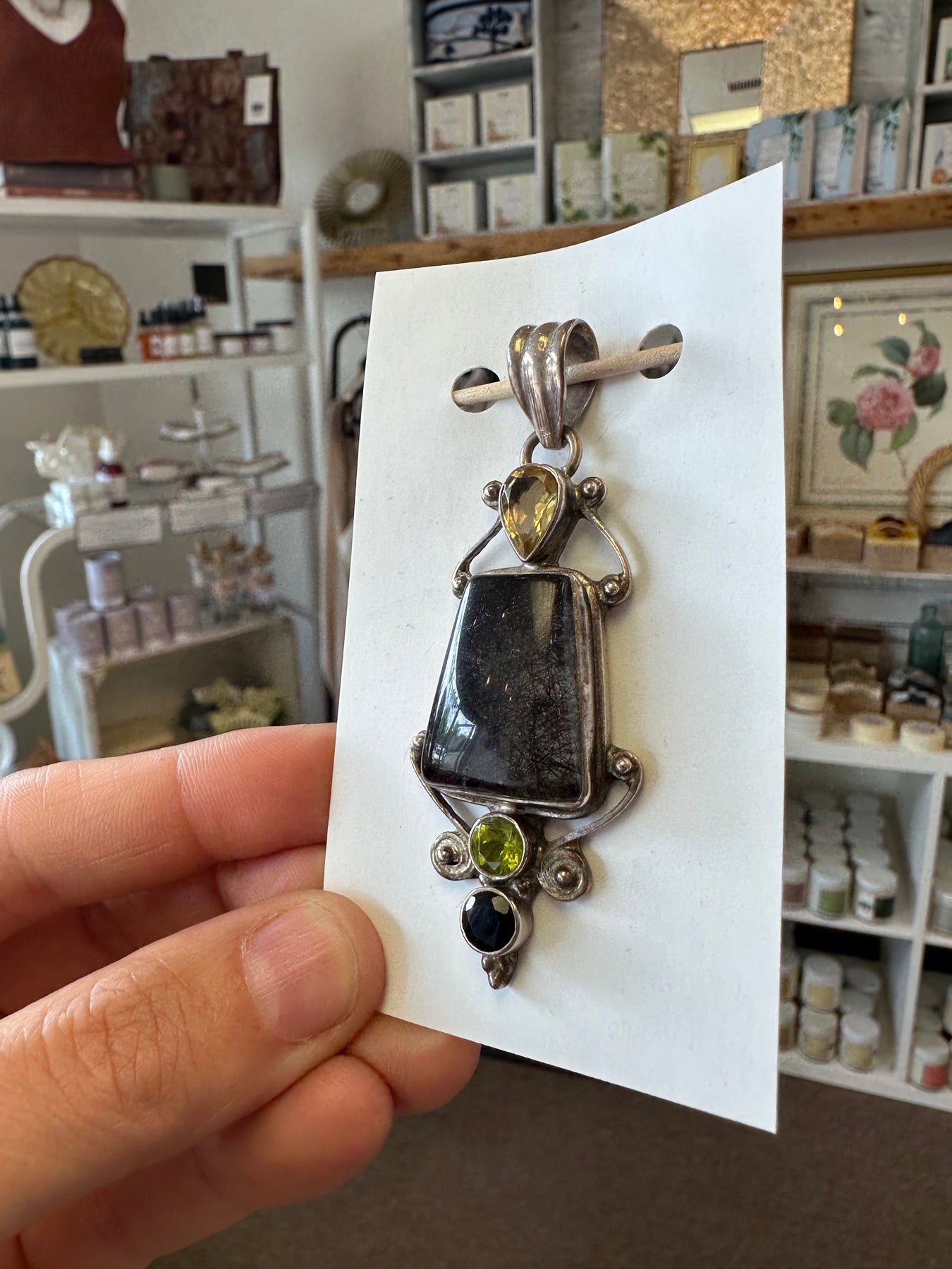 The Vintage Rutilated Quartz, Citrine, and Chrysoberyl Silver Handcrafted Pendant is an exquisite piece that showcases meticulous craftsmanship and a harmonious blend of gemstones. Featuring a striking combination of rutilated quartz with its unique golden needle-like inclusions, vibrant citrine, and the rare allure of chrysoberyl, this pendant captures the beauty of nature's finest creations. Set in a beautifully detailed silver frame, each stone complements the other, creating a stunning play of color and texture. This handcrafted pendant is perfect for those who appreciate unique, artisan jewelry that tells a story, making it an eye-catching addition to any jewelry collection.