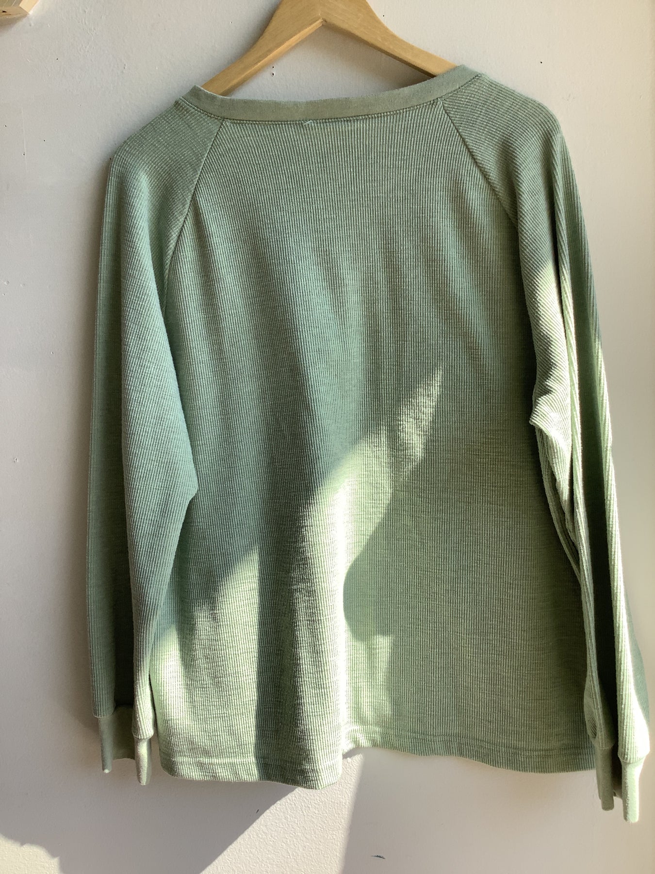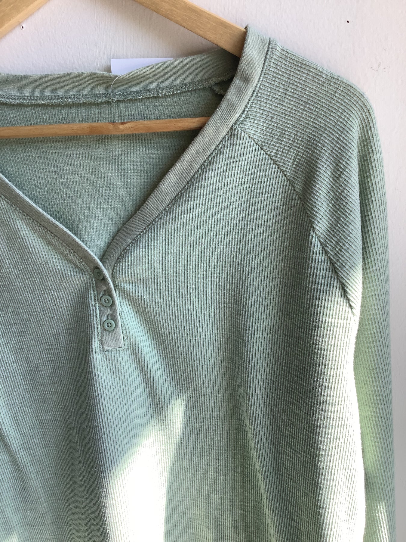 Cozy and casual, this soft sage green henley top is a timeless wardrobe staple. Featuring a subtle ribbed texture, three-button neckline, and relaxed fit, it’s perfect for layering or wearing on its own for effortless everyday style.