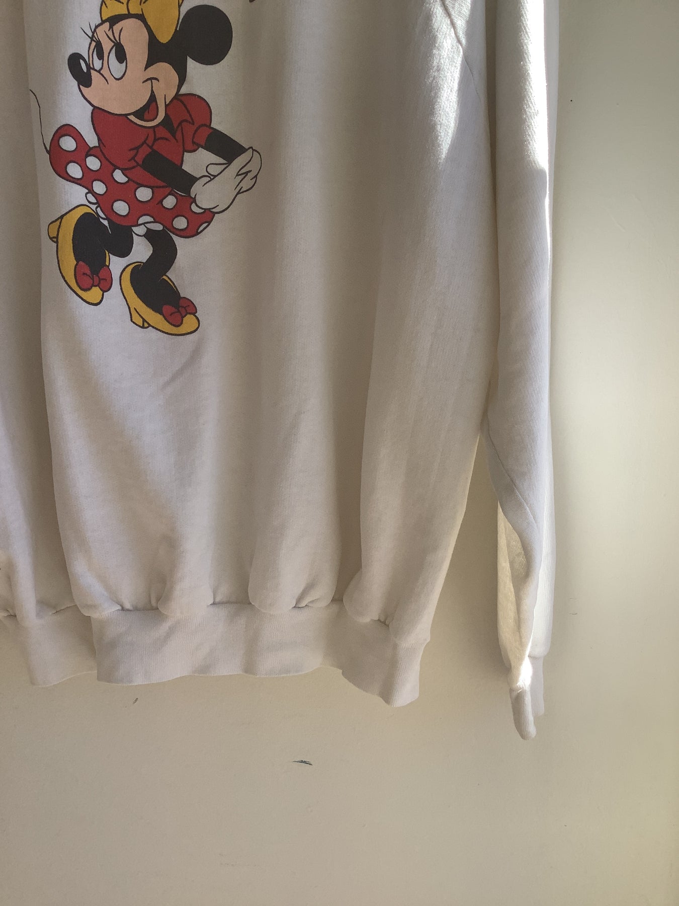 Bring some retro Disney magic into your wardrobe with this vintage Minnie Mouse crewneck. Featuring Minnie in her classic polka-dot dress surrounded by hearts, this cozy white sweatshirt is a nostalgic gem. With ribbed cuffs, hem, and neckline, it’s comfy and effortlessly cute—perfect for layering into fall and winter. Size XL