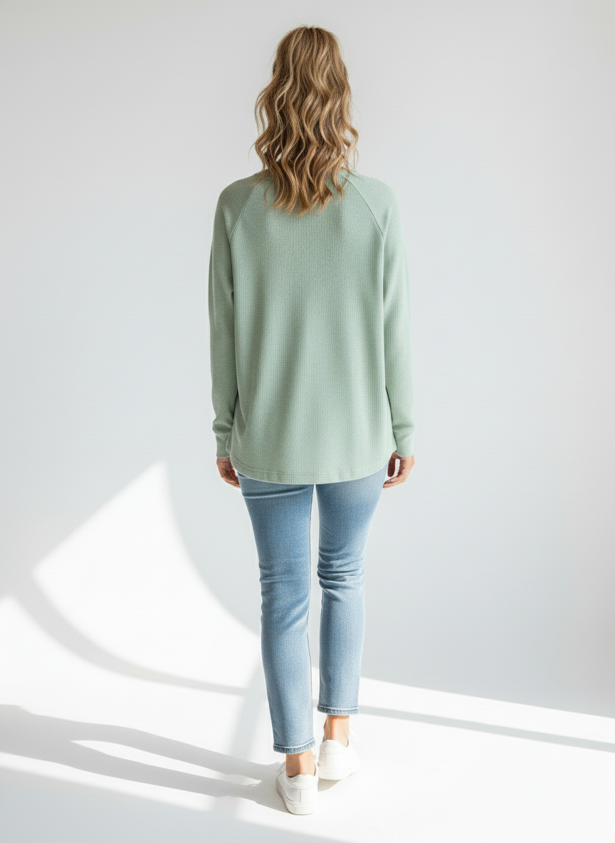 Cozy and casual, this soft sage green henley top is a timeless wardrobe staple. Featuring a subtle ribbed texture, three-button neckline, and relaxed fit, it’s perfect for layering or wearing on its own for effortless everyday style.