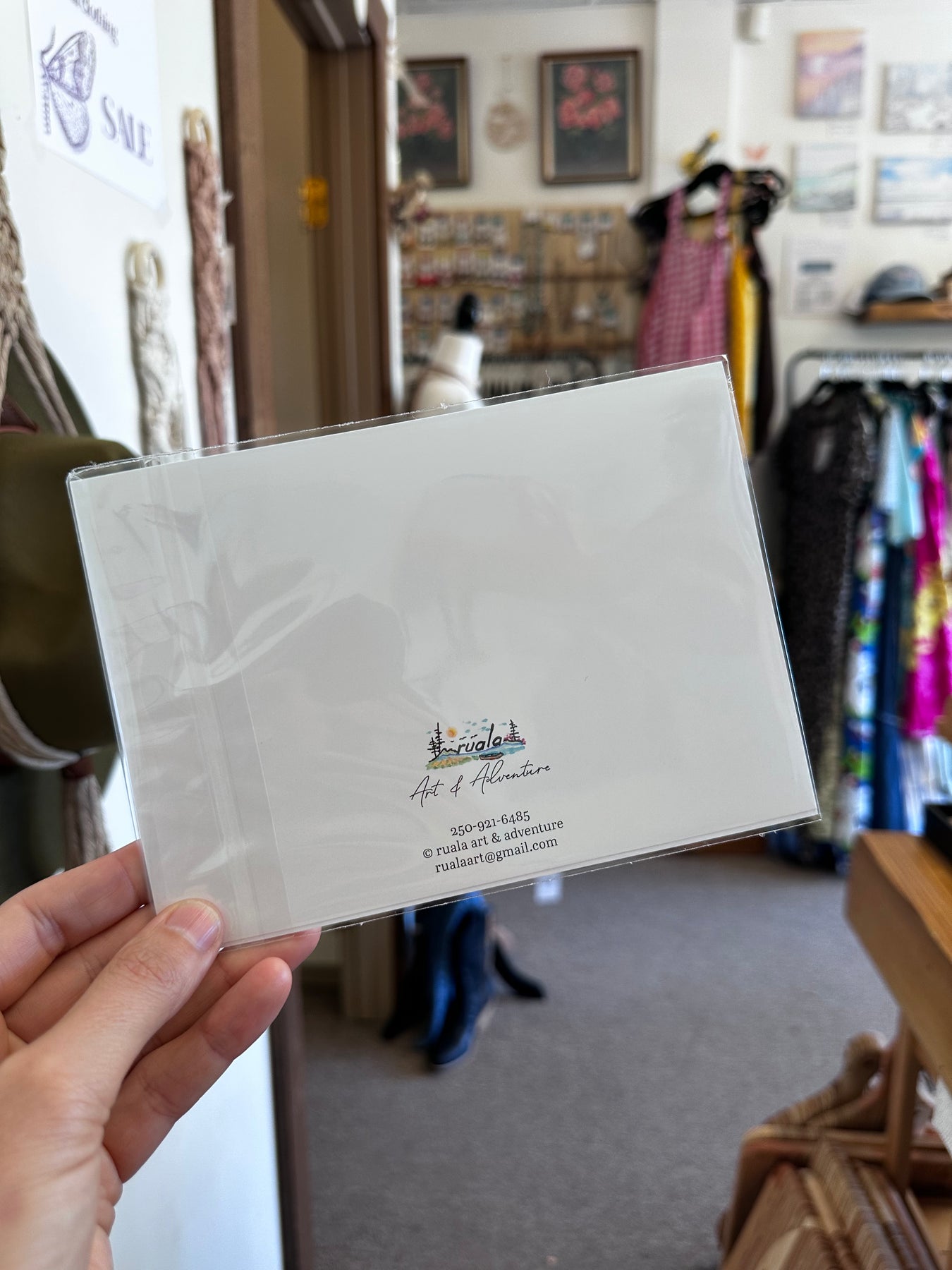 A striking card for mountain lovers and dreamers, or a beautiful little piece of Kootenay art to brighten your space. ✨