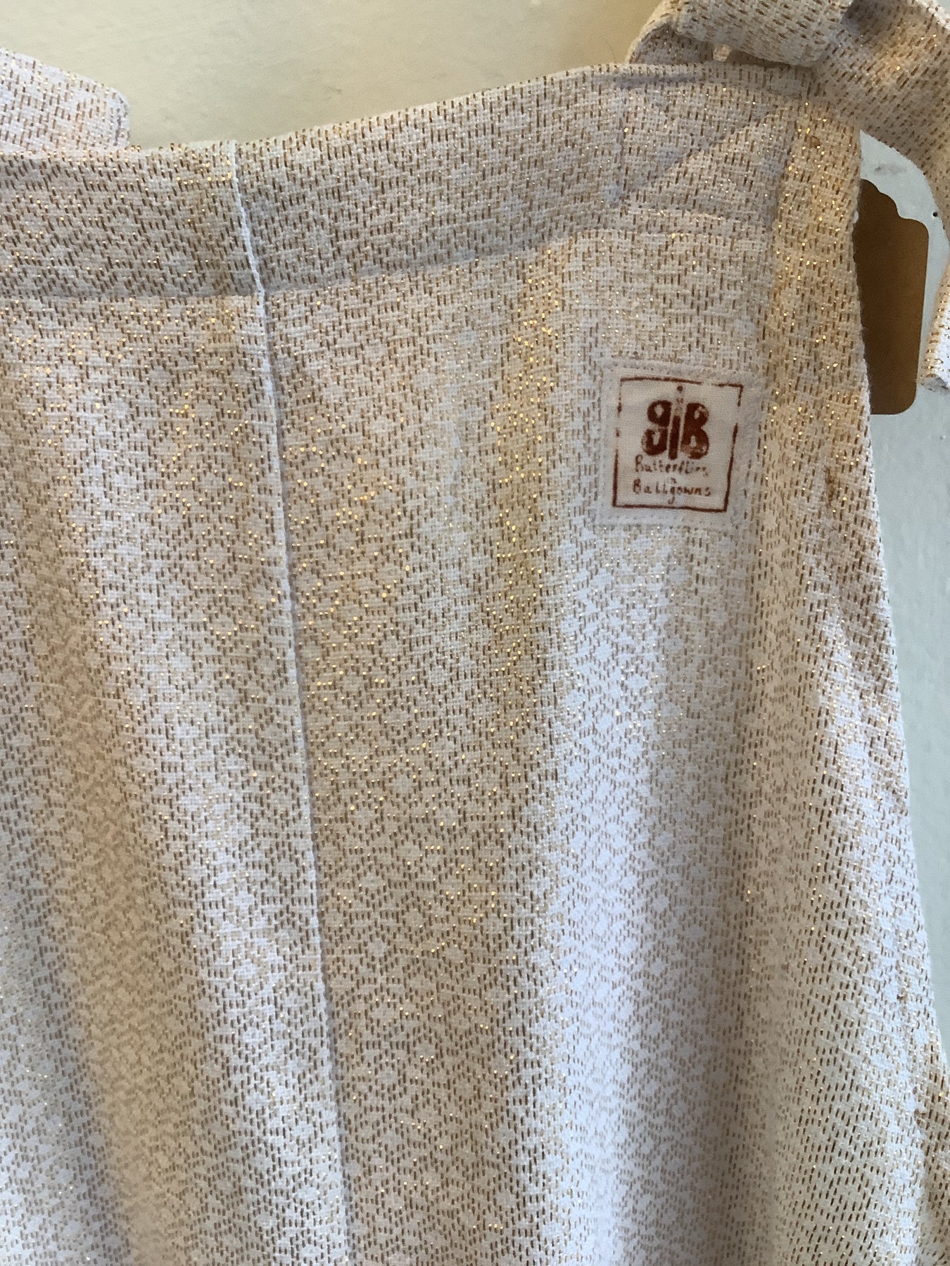 Handmade in Nelson, this dreamy overall dress brings a touch of subtle shimmer to your everyday. The white textured fabric is woven with tiny gold flecks, giving it a soft, almost-tweed look that catches the light beautifully without feeling flashy. It’s effortless, feminine, and quietly magical.