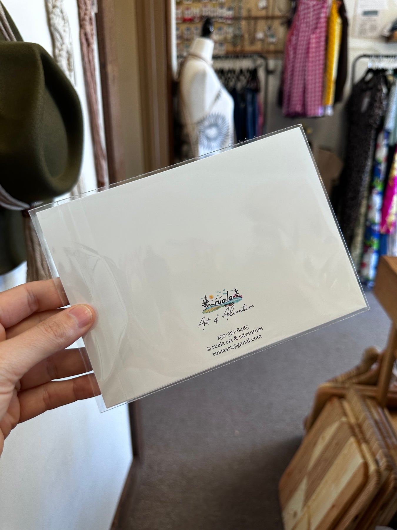 This cozy scene by Ruala Art & Adventure captures the magic of camping under the stars. A glowing campfire and tent sit nestled among tall pines, while the moon rises over mountain silhouettes in the distance. Warm, adventurous, and full of nostalgia, this card feels like a little piece of a perfect night outdoors.