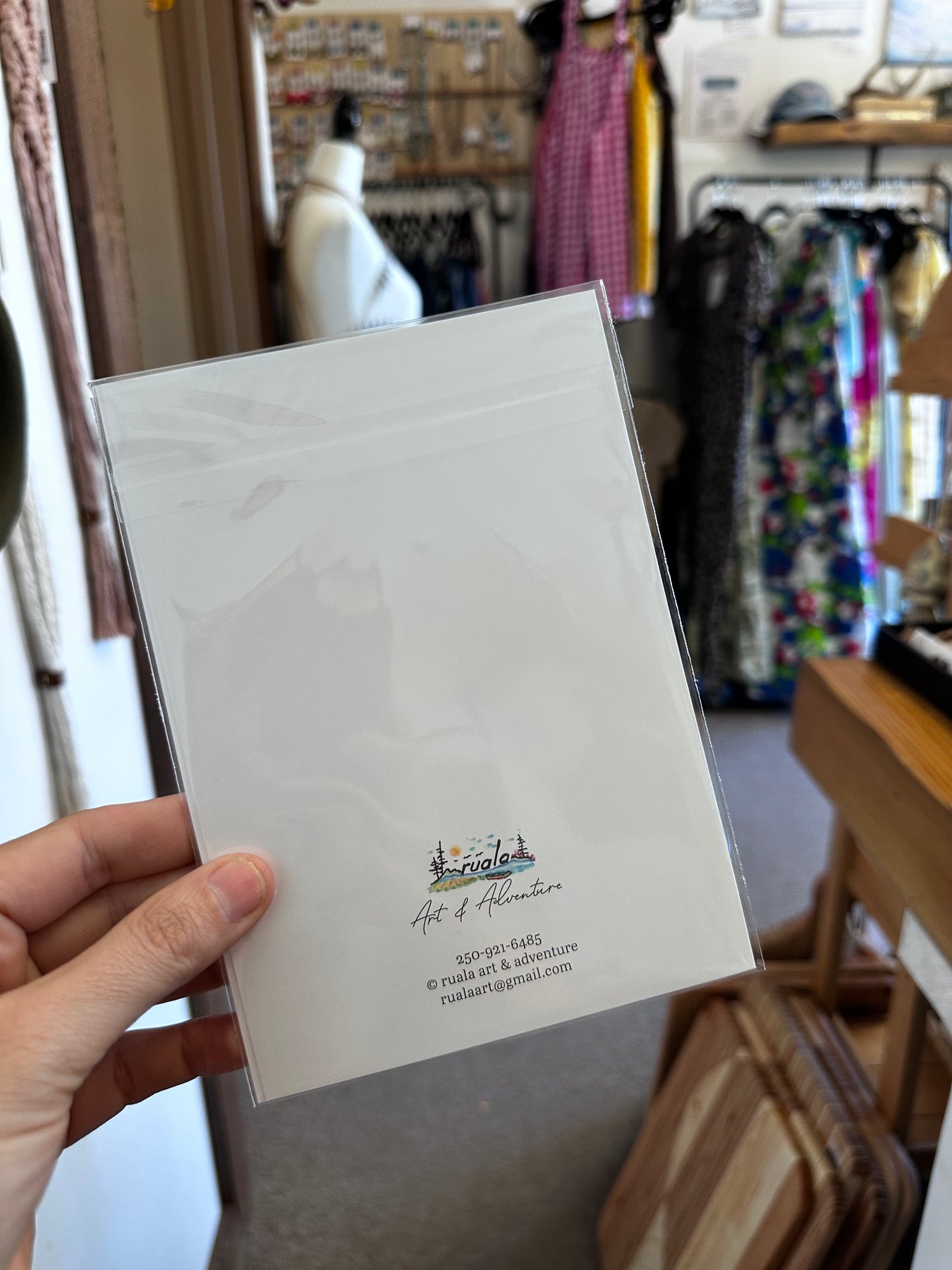 Painted by Ruala Art & Adventure, this piece captures the magic of a mountain sunset through the trees. The fiery sky glows in shades of red, orange, and pink while dark pines stand tall in the foreground, creating a striking contrast between light and shadow. It’s a card that feels powerful, grounding, and full of wonder.