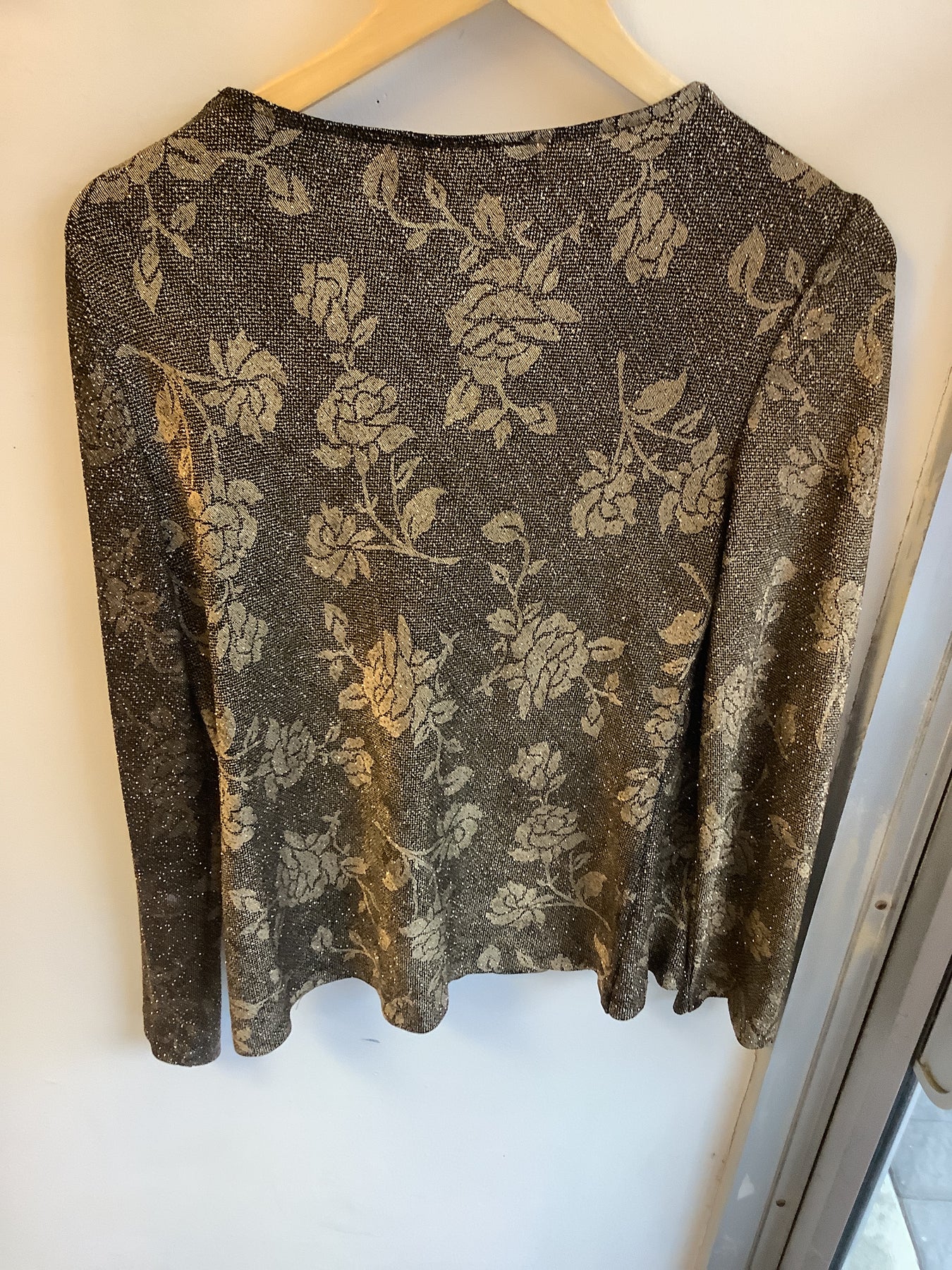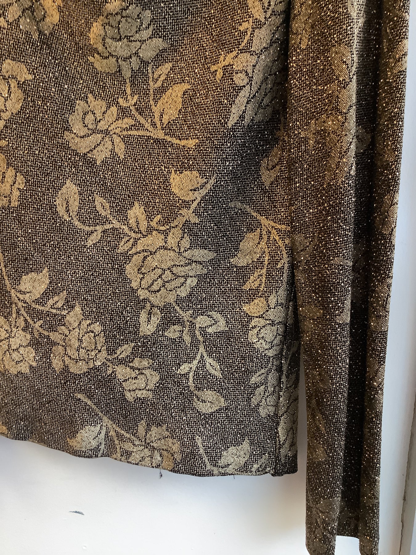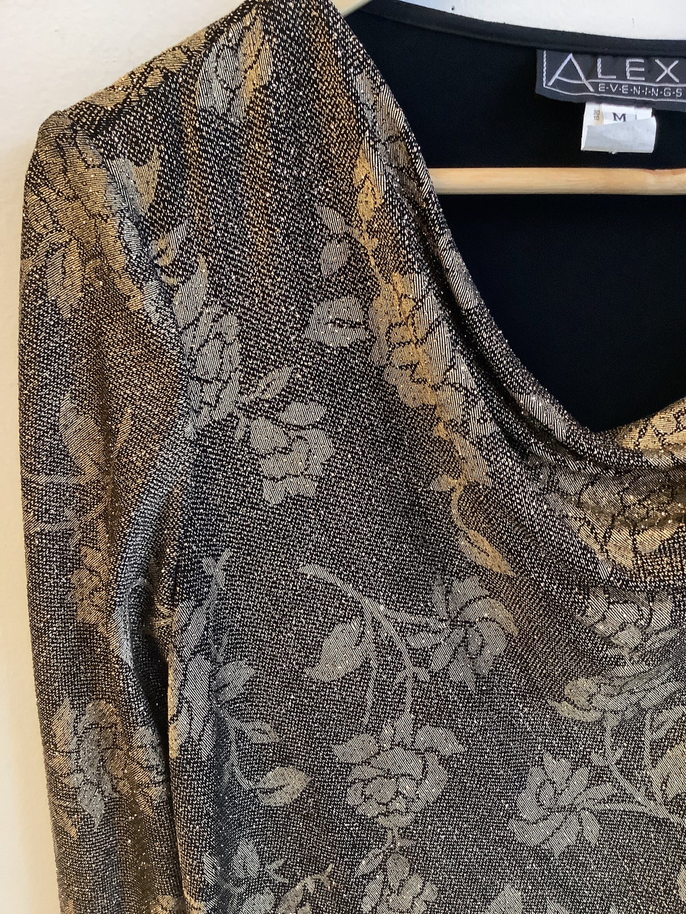 Elevate any outfit with this stunning Alex Evenings Golden Rose Top in size Medium. Featuring a soft cowl neckline, long sleeves, and a shimmering gold floral jacquard, this piece is classic, elegant, and effortlessly glam. The metallic finish catches the light beautifully, making it perfect for holiday dinners, winter weddings, concerts, or any night you want to feel timeless and dressed-up without trying too hard.