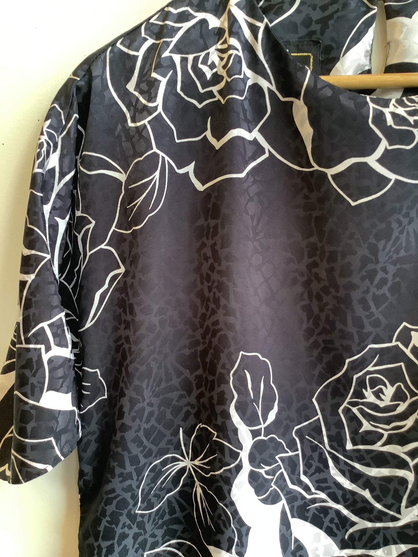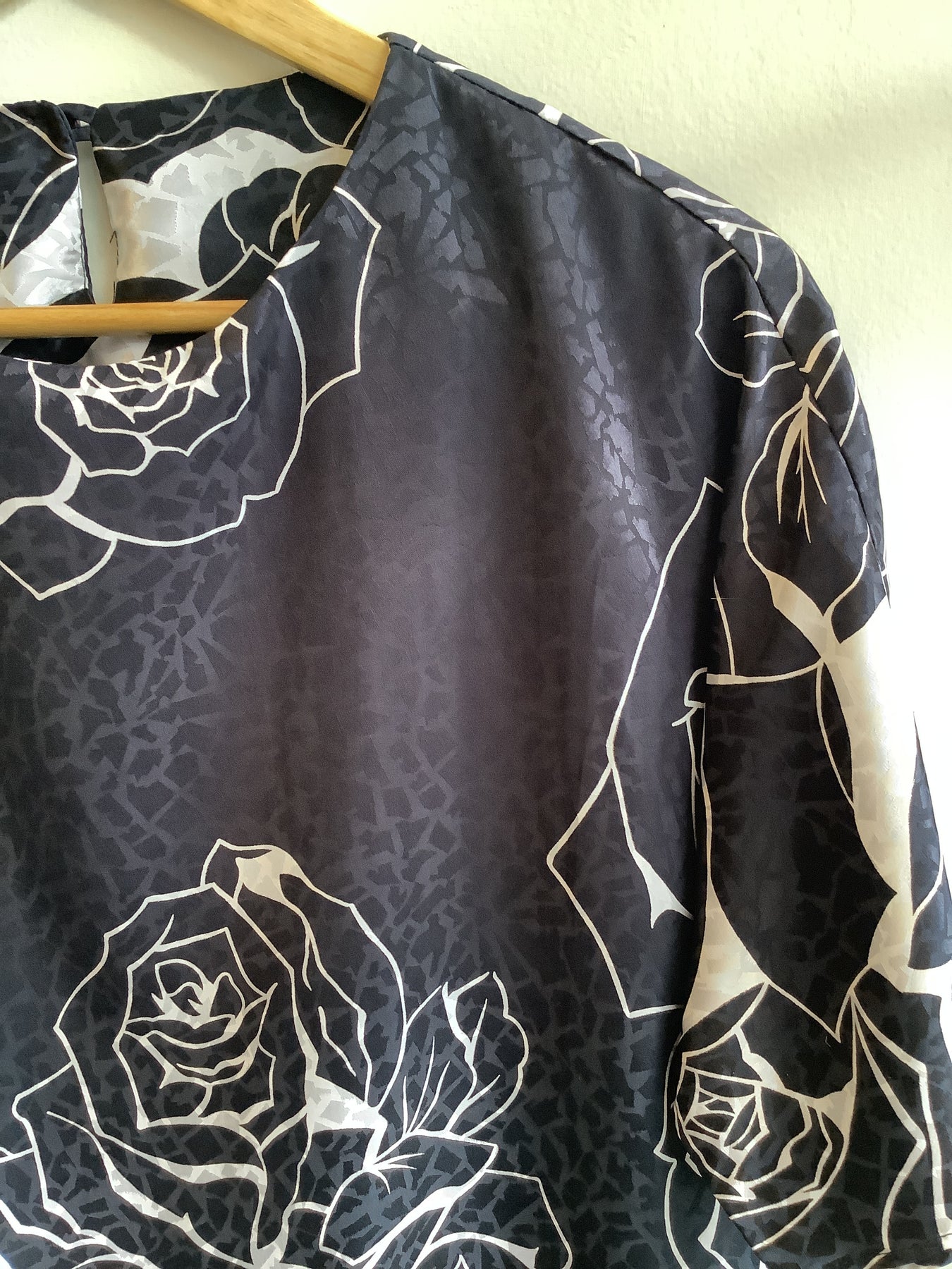 dreamy vintage blouse by Marjorie Hamilton, featuring an oversized white-on-black rose print that feels both bold and romantic. The lightweight woven fabric drapes softly with a relaxed, easygoing fit. Finished with a subtle back keyhole and short sleeves, it works beautifully tucked into high-waist denim, styled with a skirt, or layered under a cozy cardi for that artsy-cool vibe your Moonrise regulars love.