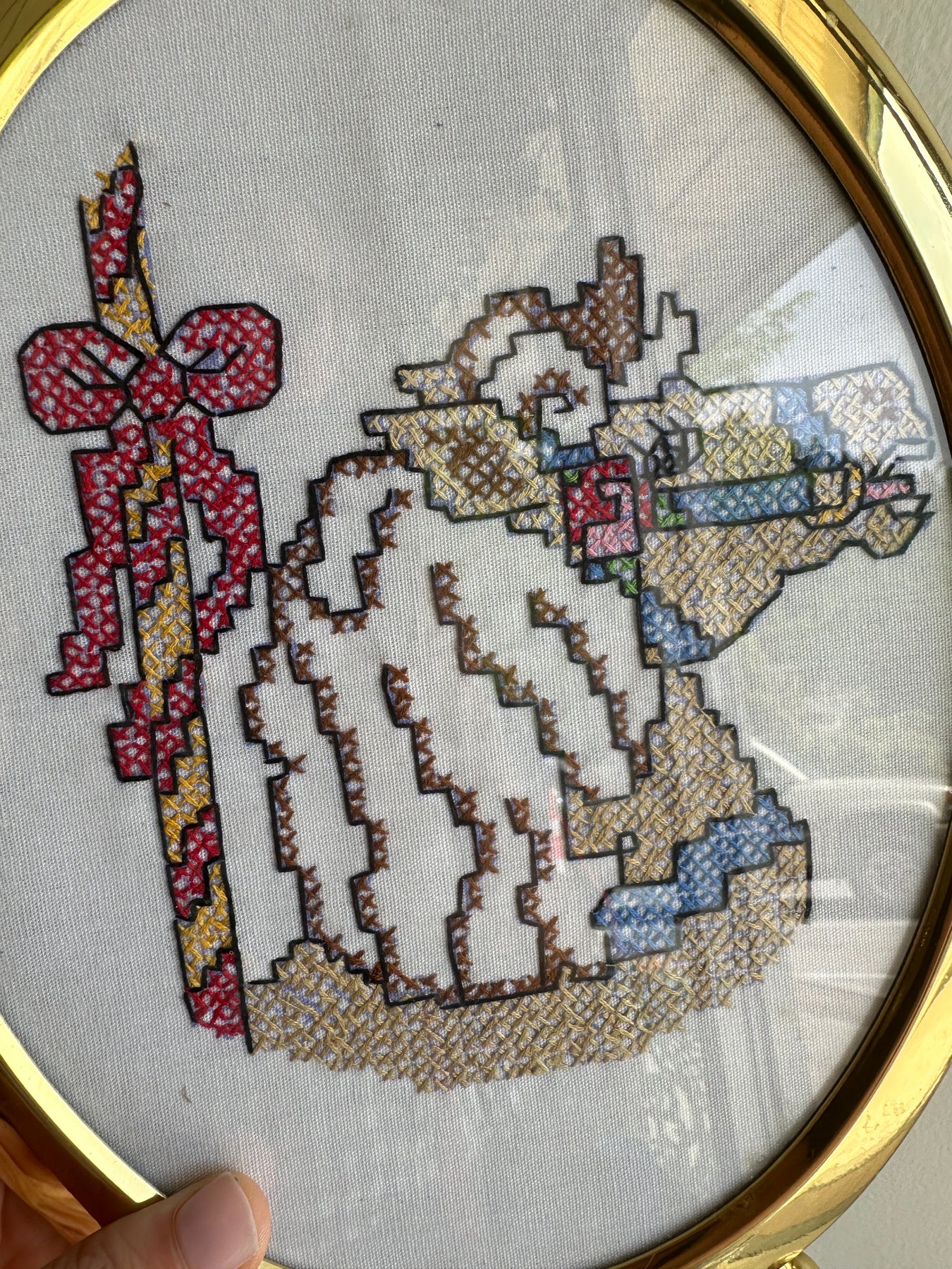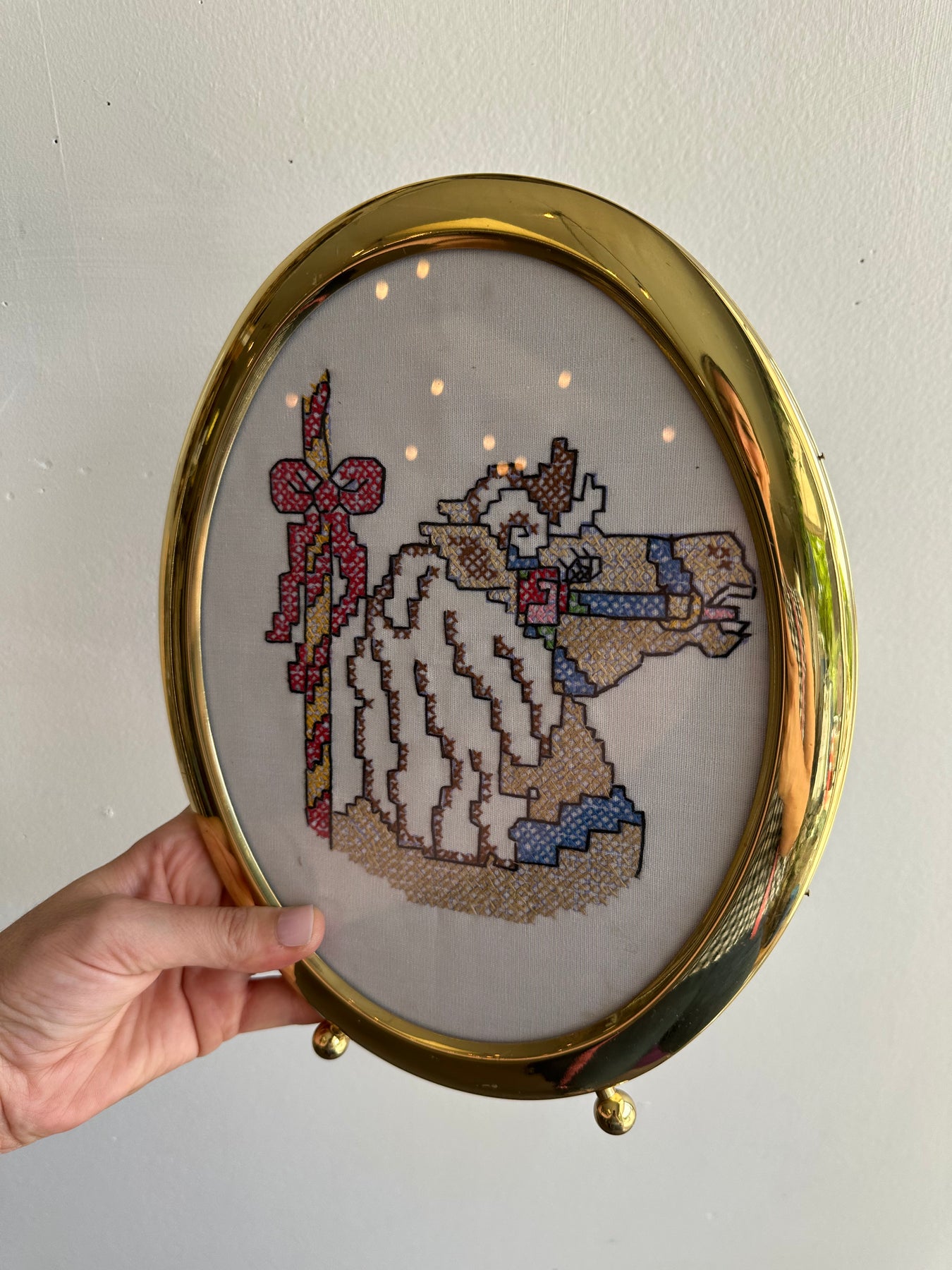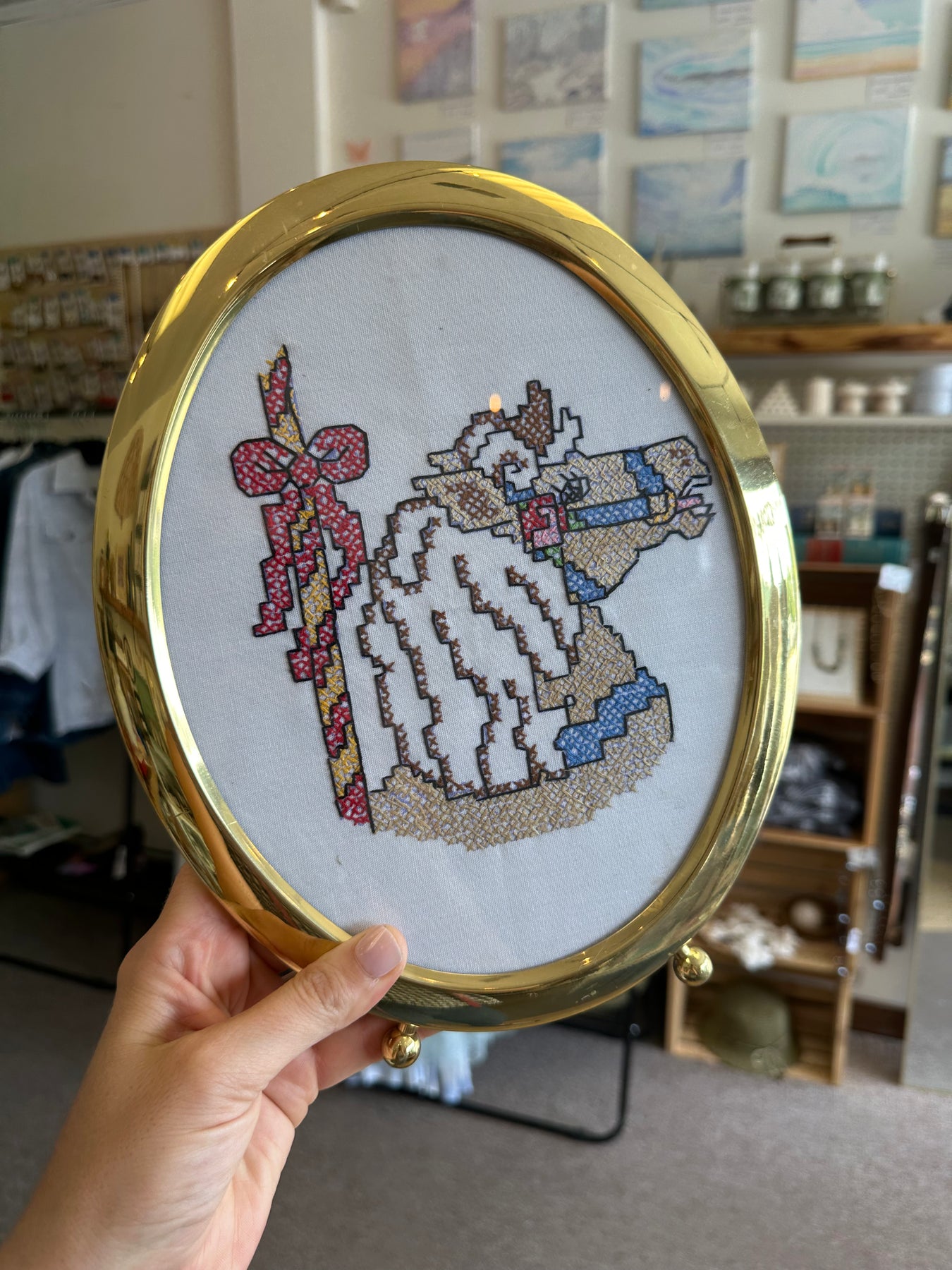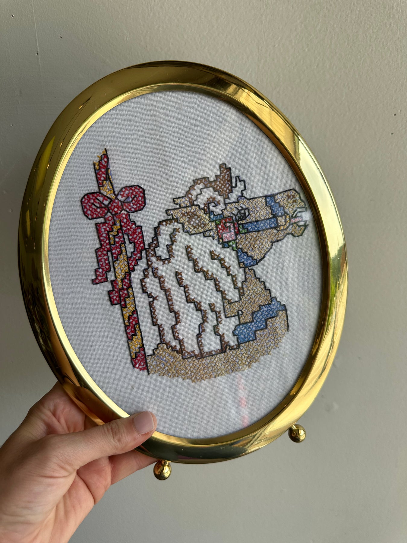 A quirky and nostalgic piece of handmade cross-stitch art featuring a stylized horse and rider, accented with a red ribbon-tied staff. Housed in a polished brass-tone oval frame with built-in feet for tabletop display, it’s a perfect little moment of whimsy and western flair.