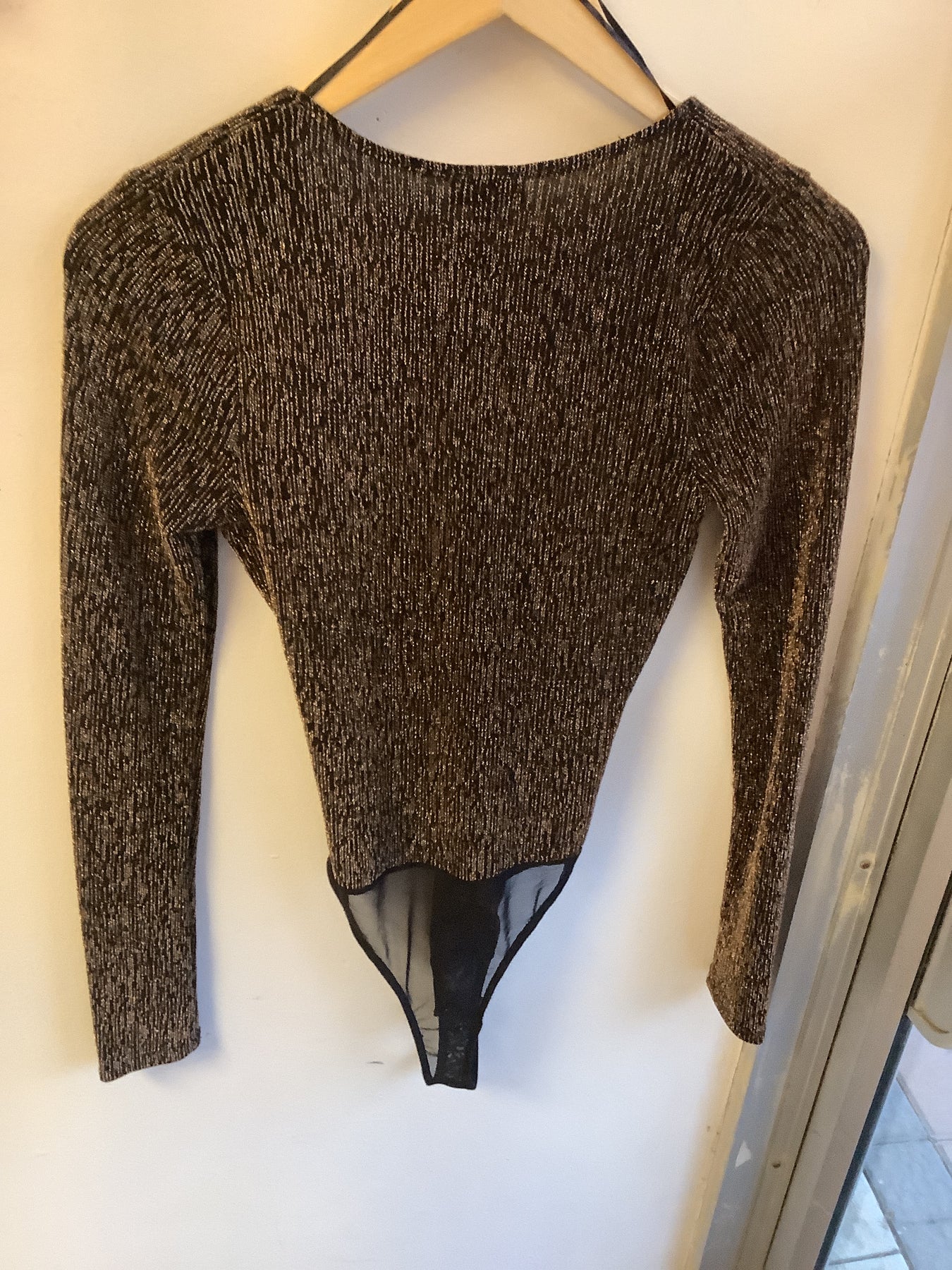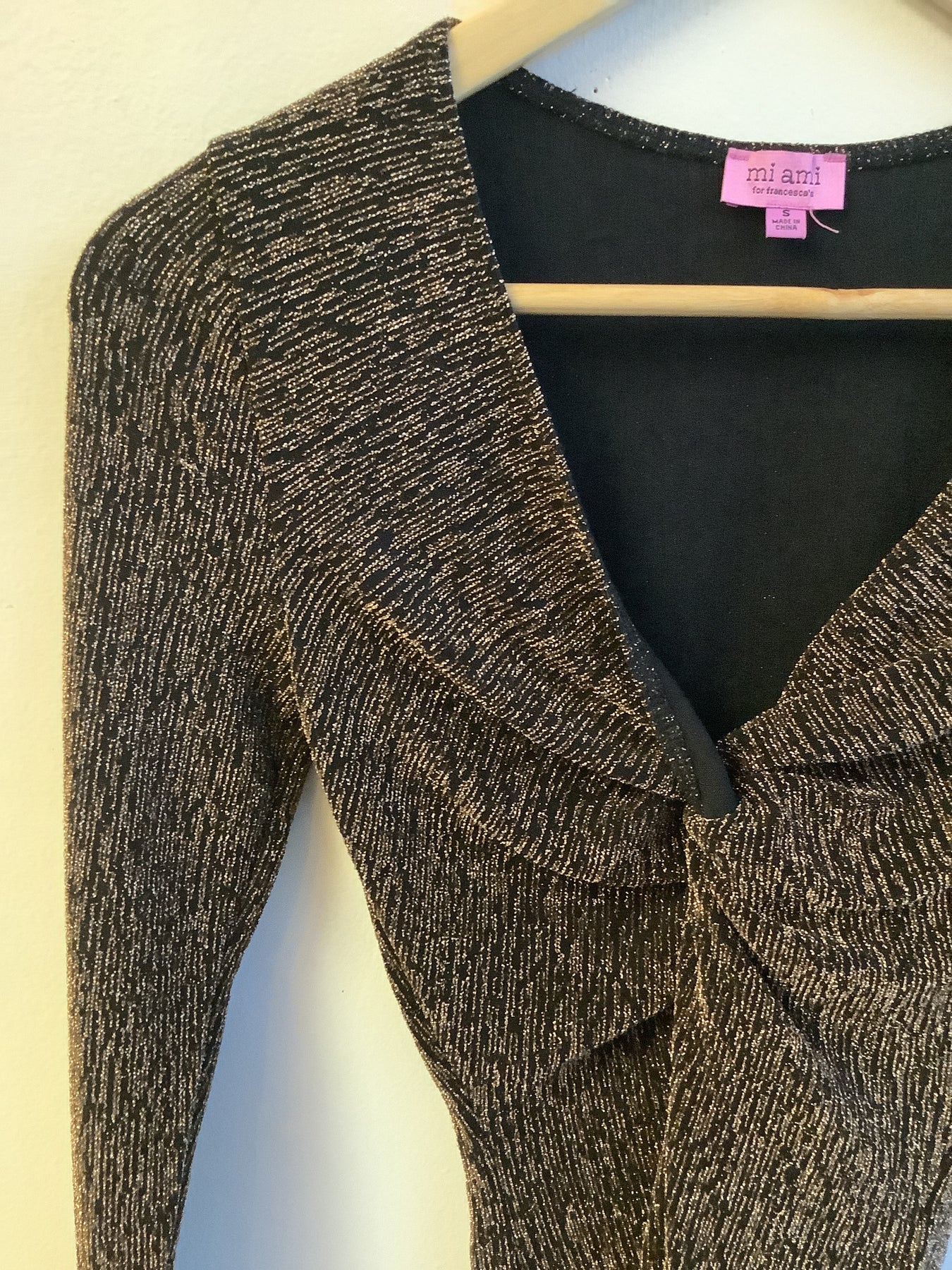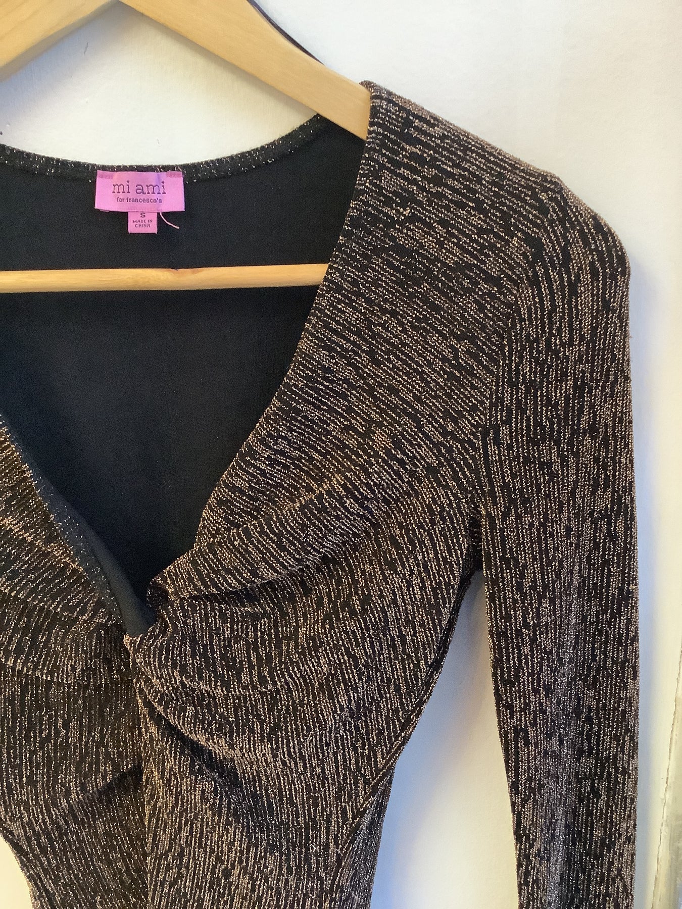 Turn every outfit into a moment with this Golden Glow Ruched Bodysuit from mi ami. The metallic gold-and-black knit has the perfect 90s/Y2K glam sheen, while the ruched front and deep V neckline give it that sultry, sculpted look. The tie-front detail adds a flirty touch, and the bodysuit fit makes it ideal for pairing with high-waisted denim, mini skirts, or wide-leg trousers.