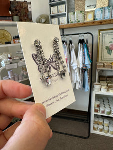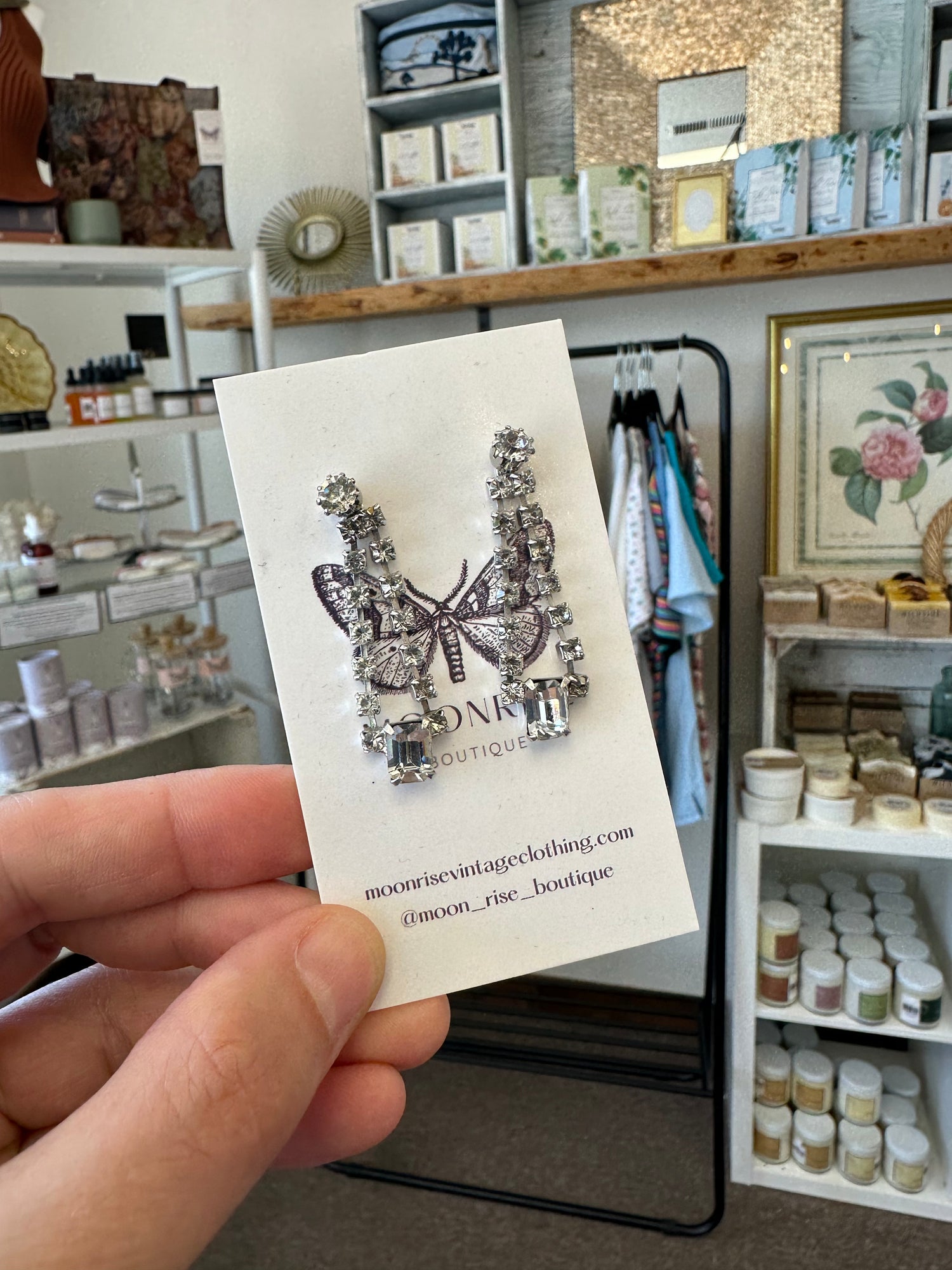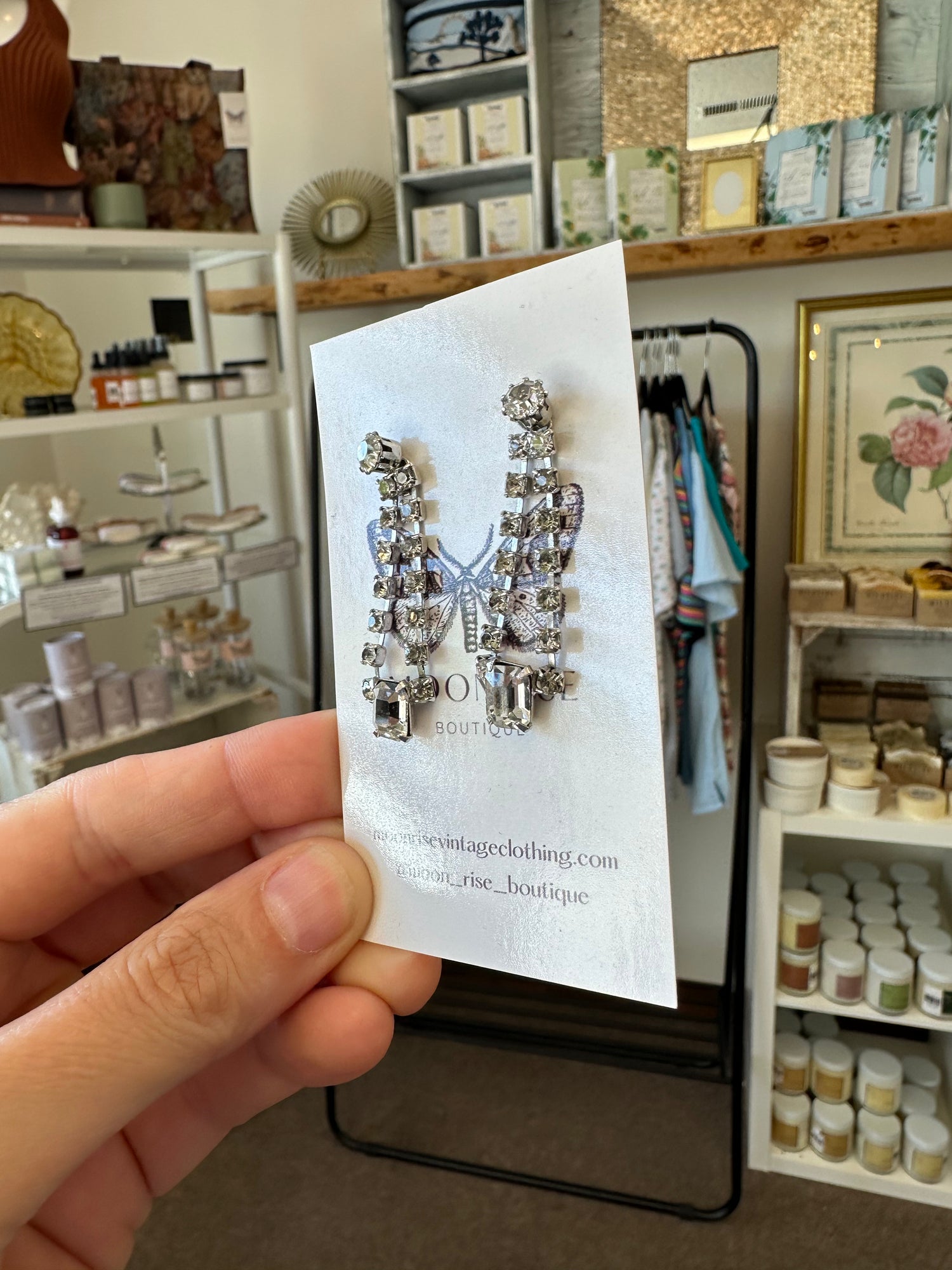 Shine bright with these stunning vintage silver crystal statement earrings from Moonrise Boutique. Adorned with sparkling crystals that capture light beautifully, these elegant pieces bring sophistication to any look. Perfect for both casual outings and elegant events, these earrings are a timeless addition to your jewelry collection, ideal for those who love to make a statement with vintage flair!