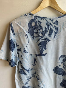 Breezy and beautifully understated, this lightweight tee features a soft blue base with intricate indigo botanical prints. Relaxed fit with a slightly curved hem, it’s perfect for warm days, slow mornings, or layering with your favorite worn-in denim. A subtle statement piece with an easygoing spirit.
